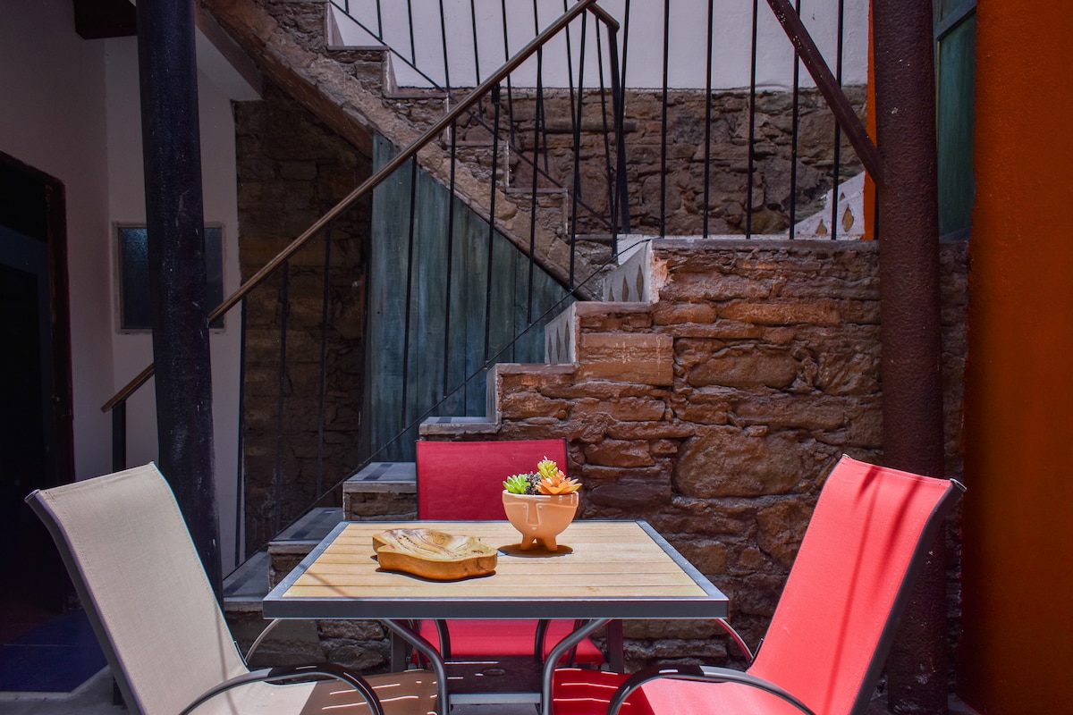 グアナファトで最も魅力的で静かなエリアの1つであるプレサ・デ・ラ・オジャの前にある美しい古い家にある、アートとデザインが施された広々とした明るい部屋をお楽しみください。 専用バスルームと、歴史と現代的なデザインを組み合わせたユニークなディテールが特徴です。テラスでリラックスしたり、ロビーで遊んだりしましょう。 歴史地区まで車でわずか9分、または徒歩で18分。周囲にはカフェ、レストラン、美術館、ギャラリーがあります。駐車場は無料ですが、空き状況によりご利用いただけます。