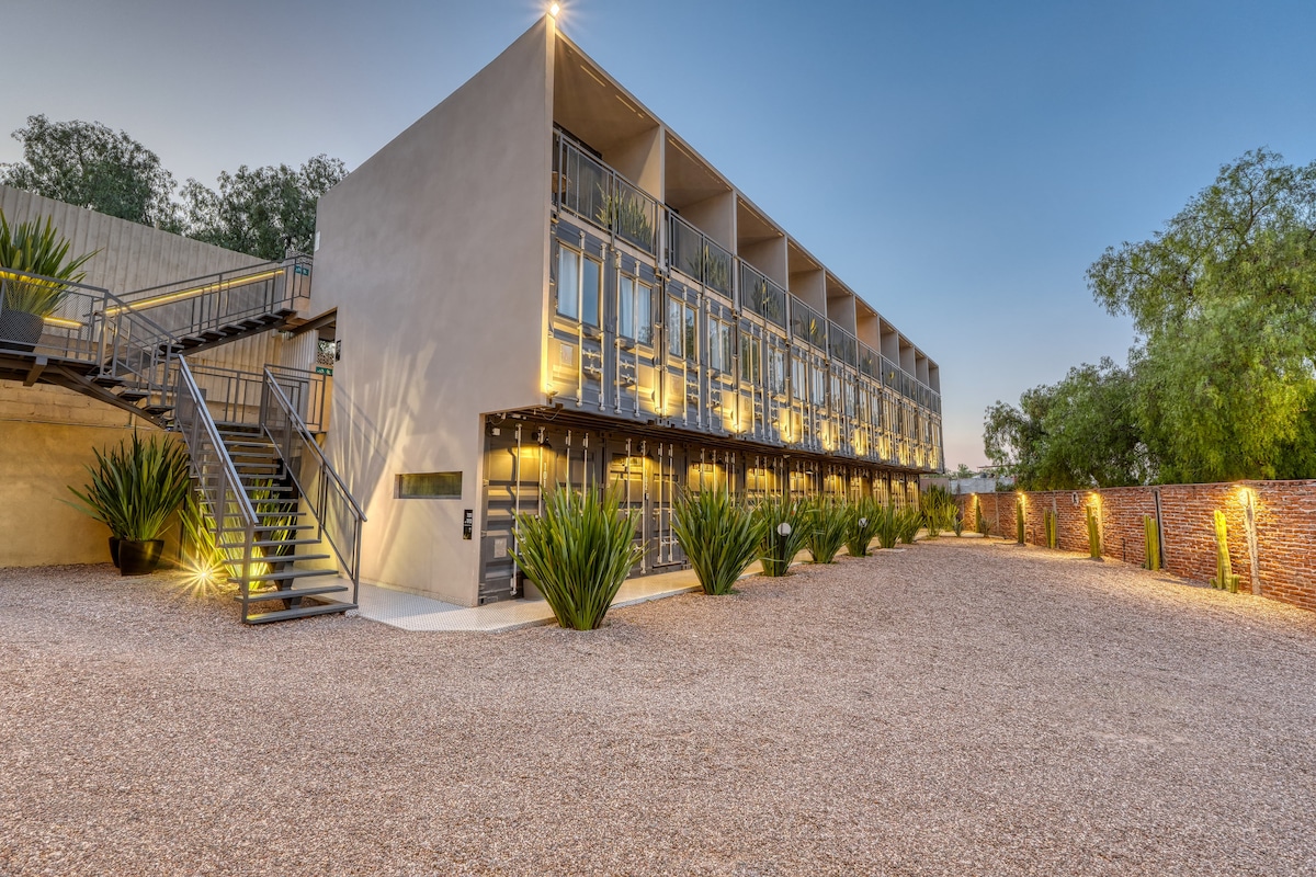 Descubre una suite hecha en contenedores marítimos una propuesta ecológica única en México desarrollada por el despacho Container Living. Disfruta de todas las comodidades, incluyendo aire acondicionado, estacionamiento gratuito dentro de las instalaciones, vistas a la ciudad y rápido acceso a las principales avenidas de la ciudad. Perfecta para viajes de trabajo o placer ya que es un lugar tranquilo y seguro, pero cuenta con todos los servicios a pocos metros de la propiedad.