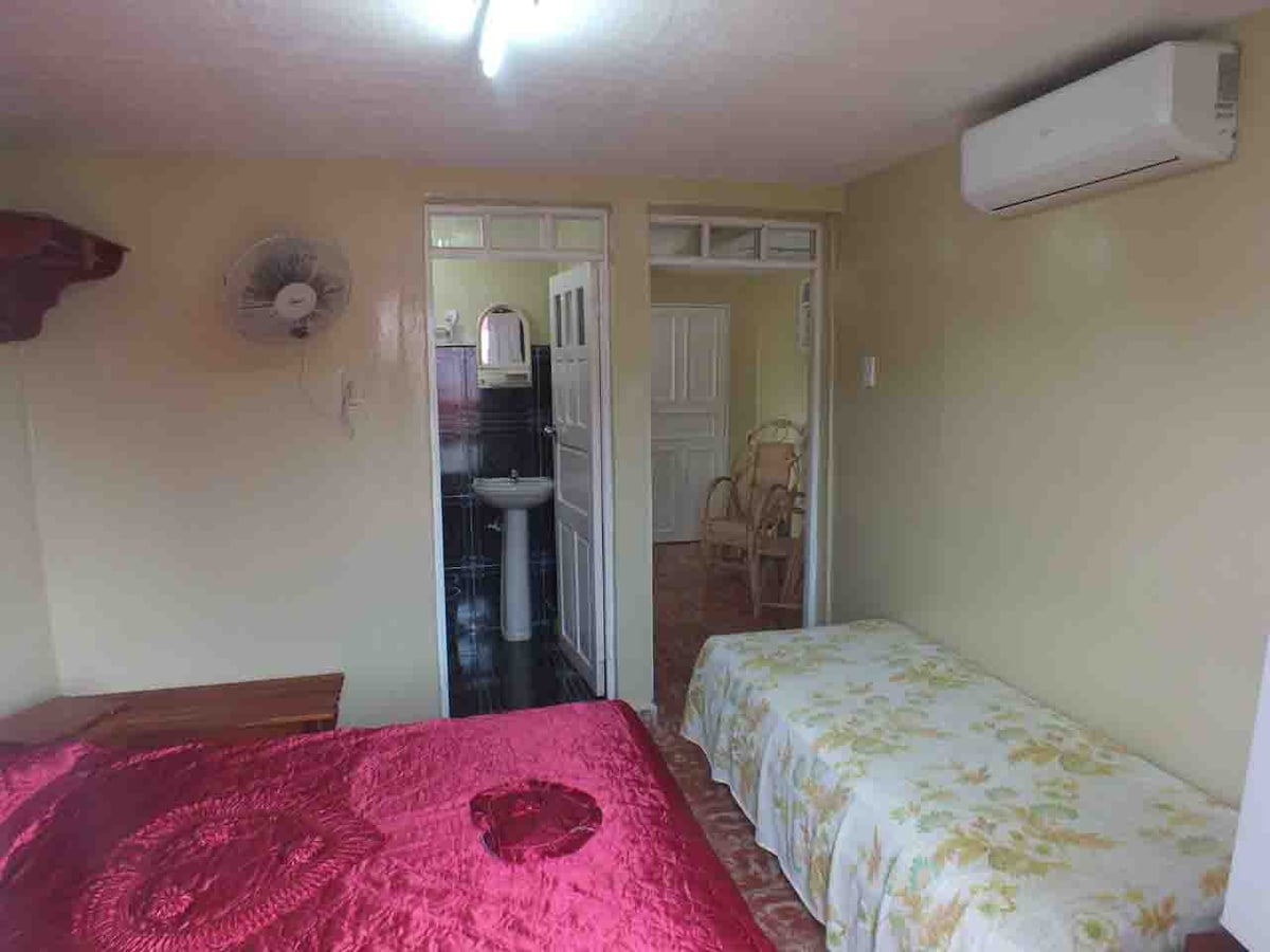 Habitacion triple muy confortable y espaciosa, con una excelente ventilacion natural gracias a su localizacion en el malecón de la ciudad, brindando una espectacular vista de un majestuoso amanecer baracoeso. Ubicada en el segundo nivel de la vivienda, climatizada con split, agua fría y caliente, nevera, con acceso gratuito a la wifi de la casa y otras comodidades. Espacio totalmente independiente.