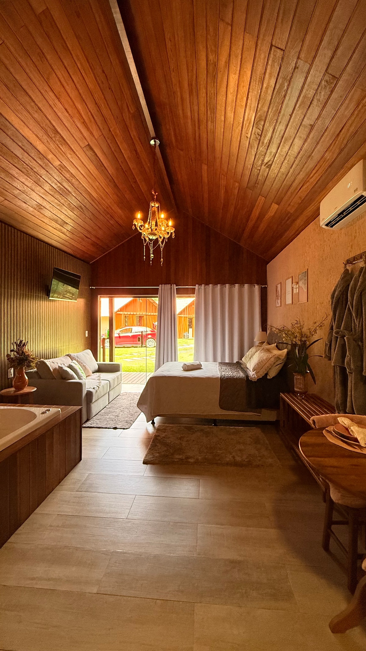 A Cabana Maravilhosa foi inspirada nas Cabanas americanas e canadenses. Um encontro lindo da natureza com a Arquitetura. Feita toda em madeira rústica, e decorada com todo luxo e design para que o hospede tenha uma experiência inesquecível com requinte e aconchego. Além de contato com a natureza, descanso e tranquilidade Aproveite o sossego de nossa região para curtir momentos a dois, descansar e se divertir.