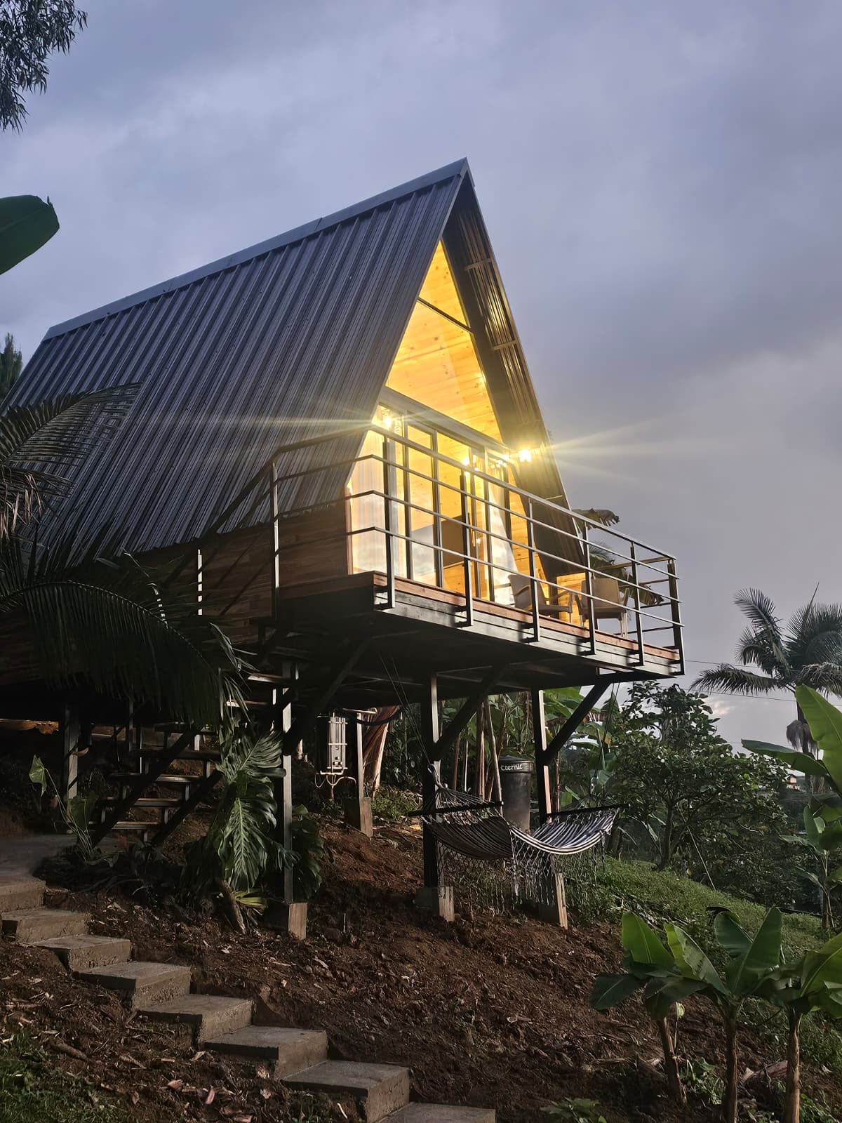 アーティストのデニス・アレクサンドロフによって設計された「木々の間のスイート」。クイーンベッド、ソーシャルエリア、設備の整ったキッチン。1700メートルの丘の上にあるこのオーナーデザインの家からは、エル・タブラソとサンフランシスコ、ラ・ベガ、グアリバの谷のパノラマビューが楽しめます。運が良ければ、ネバドス公園とネバド・デル・ルイス火山の煙を見ることができます。 暖かい気候と涼しく、蚊のいない夜。