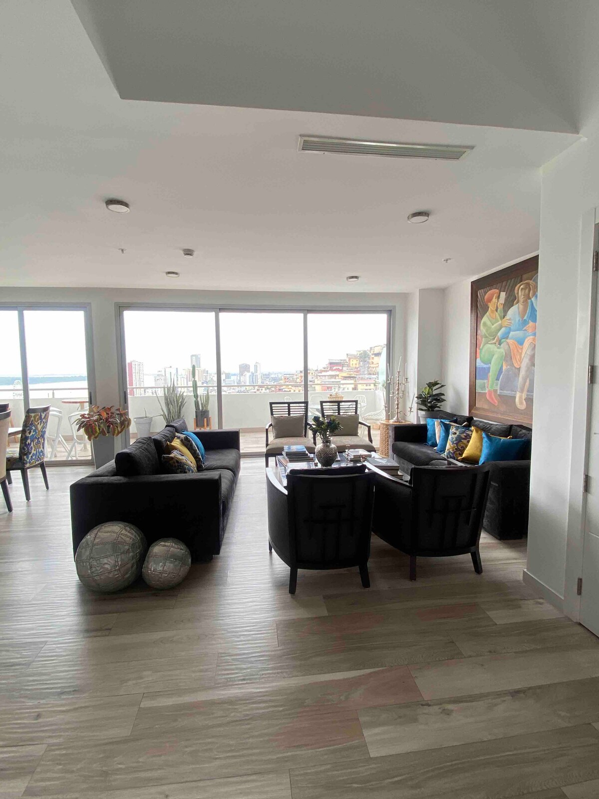 Modern Apartment with City Views Enjoy an elegant space with panoramic city views. The living room has a TV and access to streaming platforms, while the kitchen is fully equipped. The dining room offers views of the Guayas River. The apartment has two bedrooms with air conditioning, high-speed Wi-Fi, and a workstation. It also offers paid private parking ($10.00 per day) and 24/7 security.