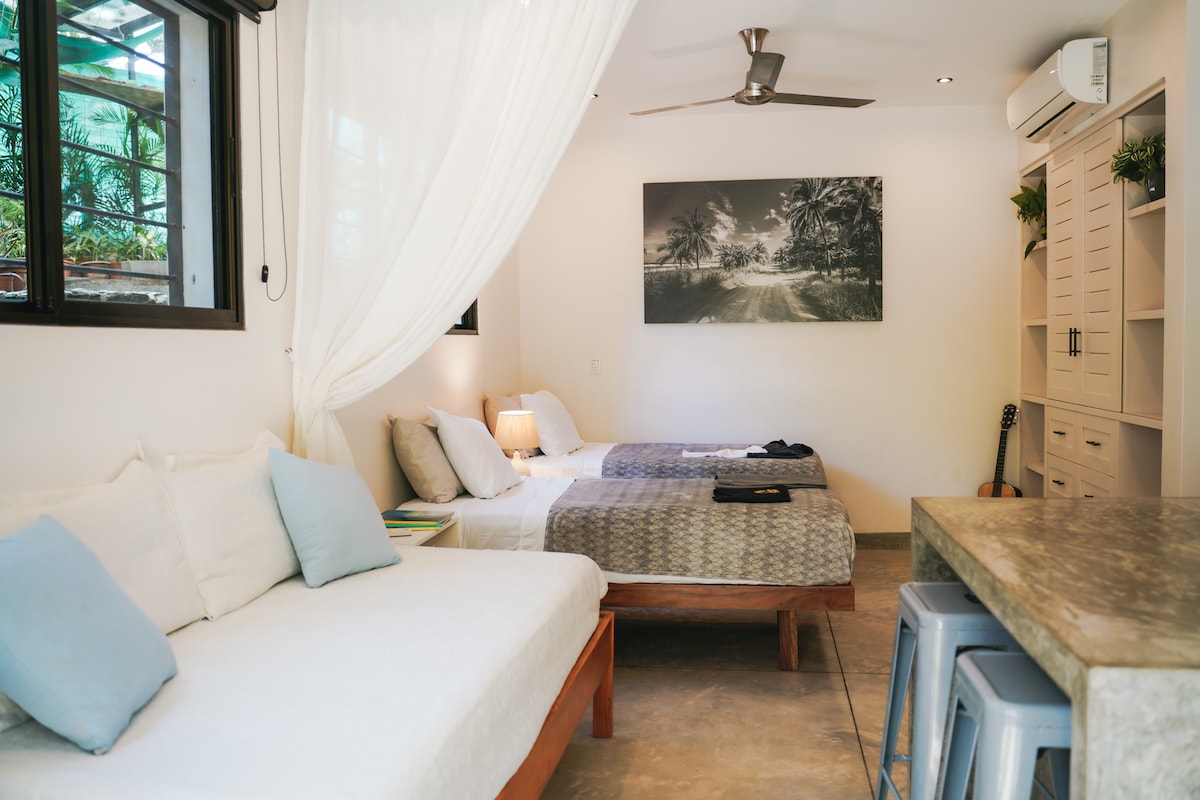 Casita de la Luna and its fraternal twin, Casita del Sol (airbnb.com/h/casacelajes-sol) make up the first floor of a newly-built house on the ocean, at the mouth of Rio Nosara. Peaceful, quiet, a bit away from Guiones and Pelada, but close enough you can walk, drive or grab a tuktuk. Enjoy your own entrance and a beautiful shared beach-front salt-water pool overlooking the wilderness. Swim, explore tide pools, SUP on the river, or surf empty waves just steps away.