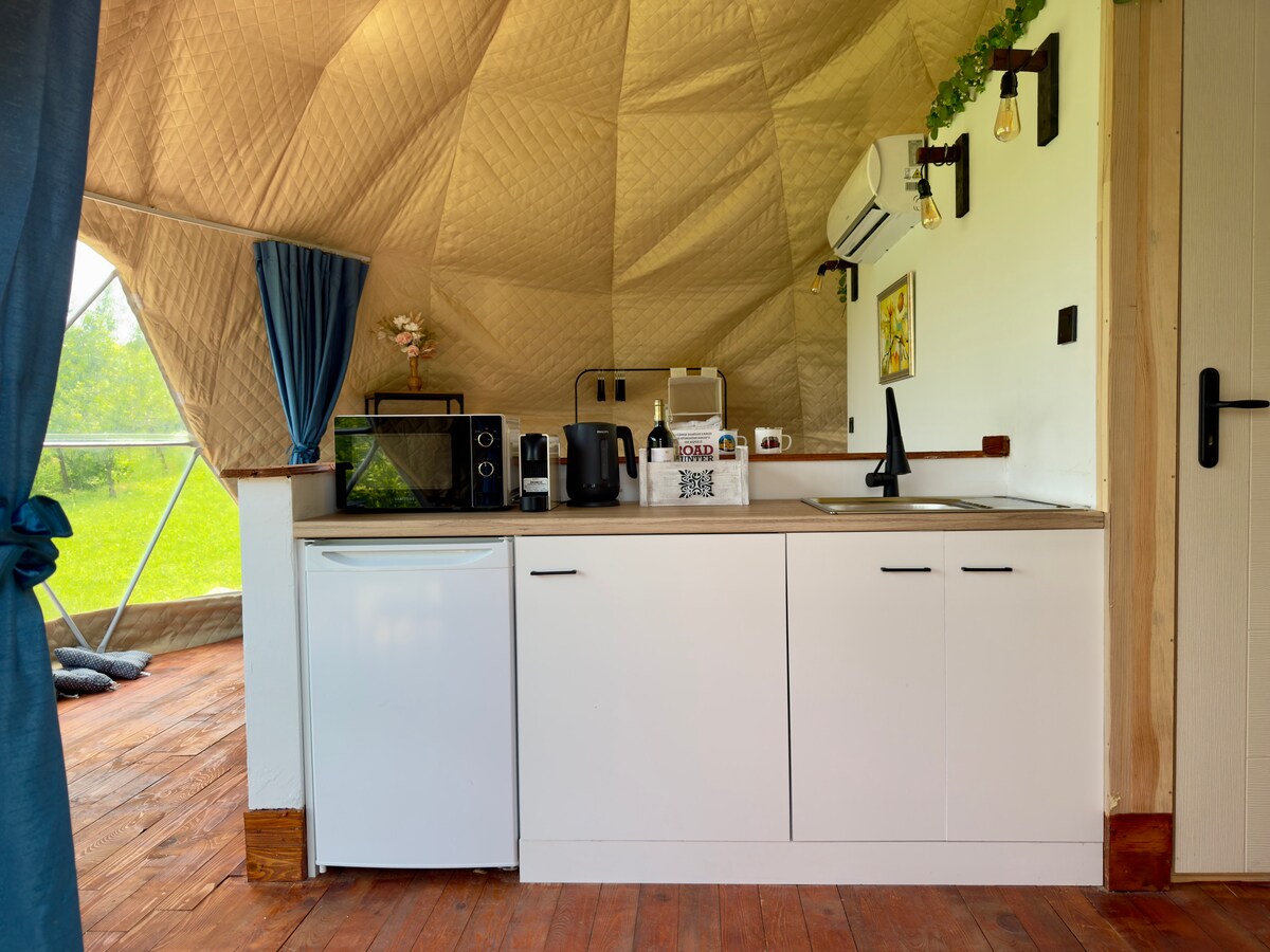 エレナ近くのバルカン山脈にある静かなジオドーム(テント)に逃避しましょう。ほとんど忘れ去られた山間の村にある、居心地のよい隠れ家は、日常の喧騒から離れるのに最適です。エアコン、快適なベッド、簡易キッチン、専用バスルーム、ボードゲームを備えており、ゆっくりと過ごす夜をお楽しみいただけます。自然と静寂に囲まれたこの宿泊施設は、落ち着きのあるシンプルな空間で、心からリラックスしたいカップルや一人旅の方に最適です。