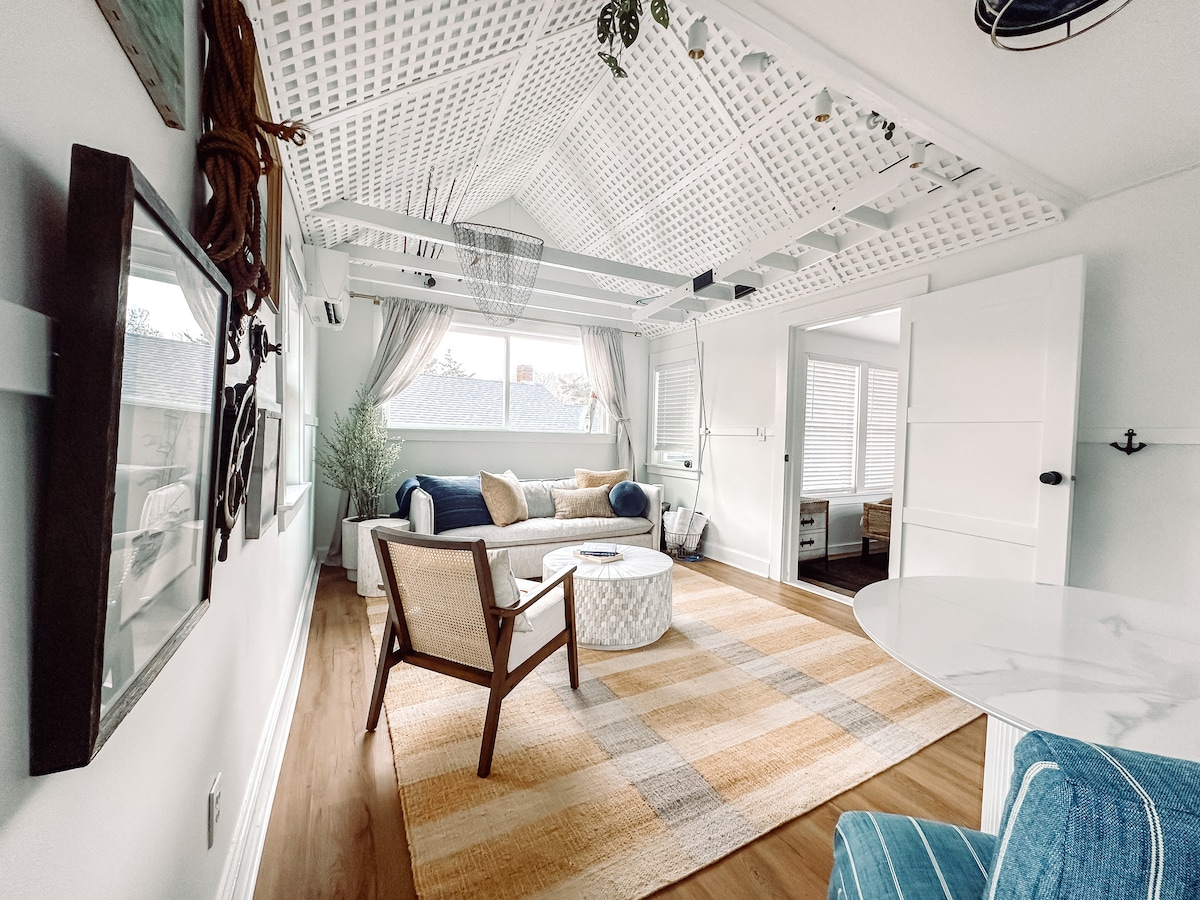 海に面したプライベートな環境のコミュニティにあるオーシャンビューの魅力的なコテージ。コンロはありませんが、コンロ、電子レンジ、トースターオーブン、シャワー付きの3/4バスルームが備わっています。 Firestick/RokuTV。快適なメモリーフォームの簡単に折りたたみ式のキングサイズのソファを備えたオープンコンセプトのワンルームです。コテージは家とは別の建物で、専用の入り口と2台分の駐車スペースがあります。ビーチから1マイル、ダウンタウンから5マイル。 **注意事項:定員2名/ソファの最大耐荷重450ポンド