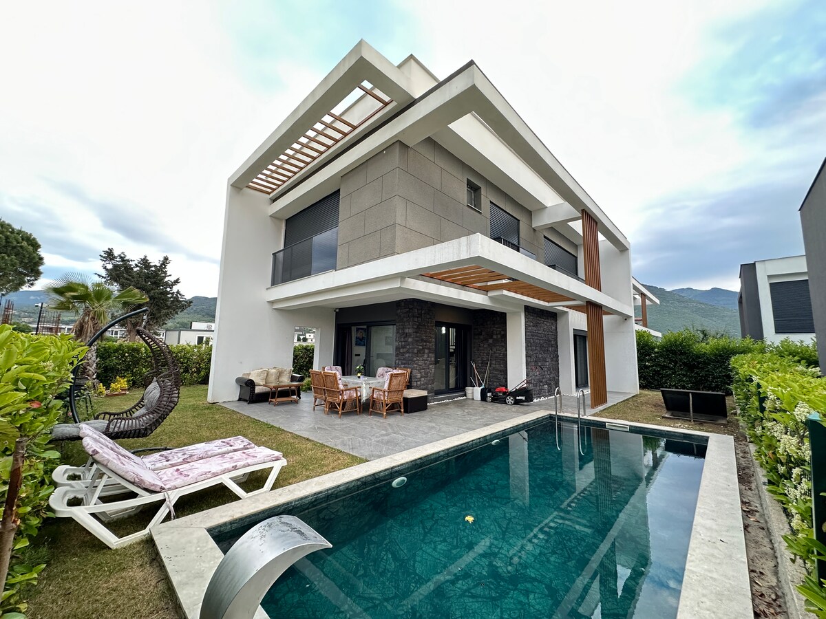 メンデレス・チャムオニュ地区に位置し、2つのベッドルーム、2つのパーソナルバスルーム、1つの共有バスルーム、合計3つのバスルームと1つのリビングルームがあります。 私たちの家は、建築家のデザインによって慎重に準備され、自然と調和した平和な環境を持っています。 プール、屋外シーティングエリア、バーベキューエリアが、ご家族で楽しめる滞在をお待ちしています。