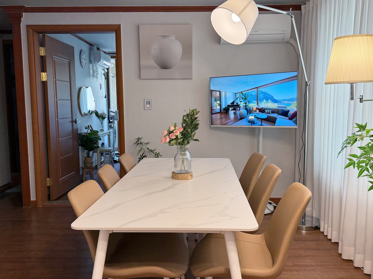 1, 2층의 공간 전체, 2~8명 사용가능, 침실 2 (퀸사이즈 베드 2), 넓은 거실 2 (퀸사이즈 소파베드 2), 화장실 2, 주방 1(조리도구 완비), 12인석 대형 호두나무 식탁(4m), 보드게임, 닌텐도 스위치 게임 보유 주방 - 전기밥솥, 전자레인지, 인덕션, 얼음 정수기, 커피머신 (에스프레소 머신), 조리도구 및 양념, 식기 도구, 와인잔, 냉장고 완비 서울 도심에서 궁궐을 배경으로 묵을 수 있는 가장 아름다운 숙소. 미공개된 창덕궁 후원 비밀 정원지역을 내려다보며 힐링을 즐길 수 있으며, 지하철역과 대중교통 모두 가까워 여행을 위한 편의도 충분. 관리자 10분 거리에 생활 중이라 언제든 필요한 대응 가능. **주차 자리는 따로 없으나, 공영주차장이 도보 5분 거리에 있습니다.