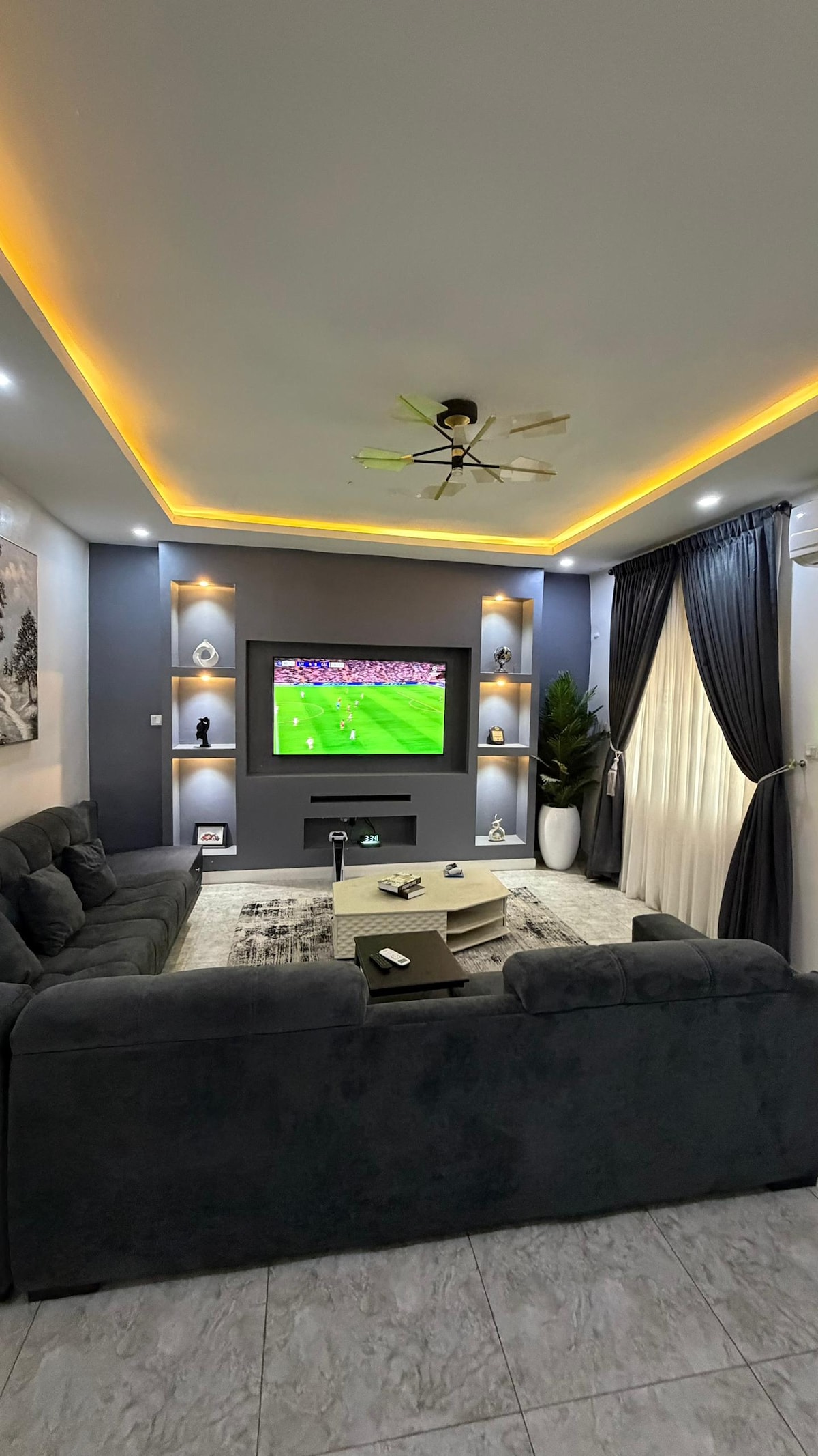 モラックホームは賑やかな都市のオアシスです。モダンでスマート、美しく明るい4ベッドルームの家は、落ち着いた家族、カップル、または友人が平和で楽しい滞在を求めている方に最適です。アブジャを訪れる間、上品にデザインされたインテリアが静かで快適な環境を提供します。宿泊施設には、プール、ゲームルーム、スヌーカー、テーブルサッカー、PS5、Netflx、高速Wi-Fi、DsTvがあります。テレビはすべてスマートテレビです。