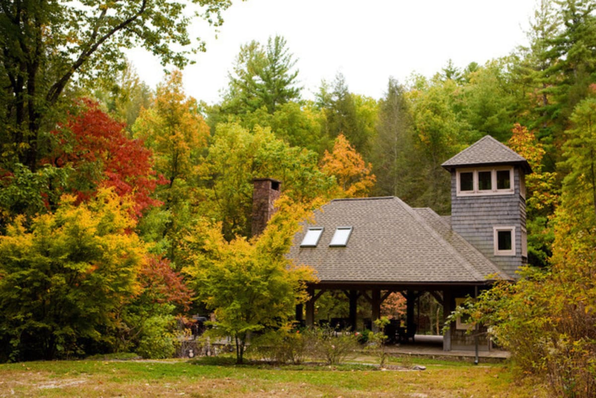 シャドーロックパビリオン&バンガローは完璧な宿泊先です!こちらは美しいパビリオンの上にある寝室1部屋とバスルーム1部屋のスイートで、リラックスできる快適な屋外暖炉と家具が備わっています。このバンガローには、コンロ、オーブン、電子レンジ、冷蔵庫/冷凍庫を備えたフルキッチン、ウォークインシャワー付きのバスルーム、キングサイズのベッドがあります。石畳の床と屋根付きパティオからは、チャトゥーガ川に流れ込むクラッピングツリーの滝が見えます。