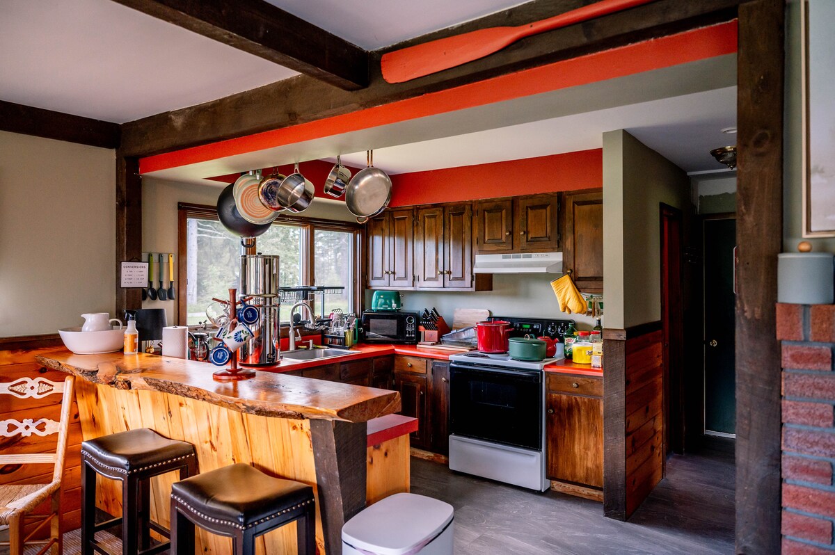 「Mellow Moose」キャビンは、森の中にたたずむ静かで平和な隠れ家です。この地域を探索したり、単に自然の中でリラックスしたりして一日を過ごしましょう。午後は、広いリビングルームの窓から太陽の光が差し込む中、読書を楽しむのに最適です。スクリーン付きの玄関ポーチで、静かな夜を過ごしながらドリンクを楽しみましょう。あるいは、キャンプファイヤーを楽しみながら、木々越しに夕日を眺めるのもおすすめです。 この宿泊施設を、スキー旅行の拠点として、またはシュルーン湖、ブラント湖、ジョージ湖を探索する拠点としてご利用ください(約30分)。