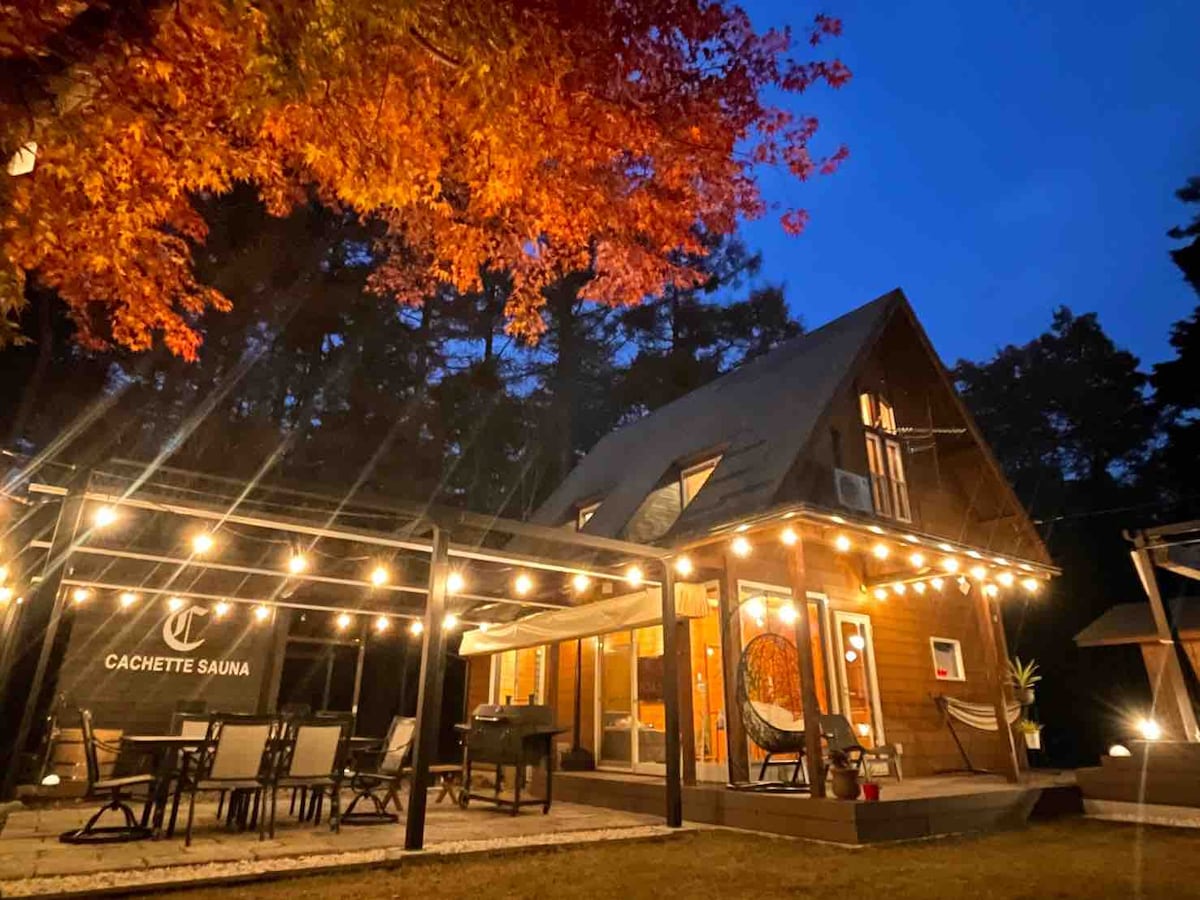 周りに何もない大自然、静かでおしゃれな空間で、のんびりとおくつろぎください。 圧倒的な非日常感、サウナ、富士山の伏流水の水風呂、ジャグジー、BBQなど盛りだくさんでおたのひみいただけます。貸別荘Cachette Foret(カシェット フォレ) 部屋定員2~8名 完全貸し切りサウナはセルフロウリュウ可能、時間制限無しでございます。(有料) ■サービス■ ・コーヒー・紅茶・緑茶がいつでも自由に飲み放題! ・持ち込みOKです。 ・設備の整ったキッチンもございます。 冷蔵庫や電子レンジ、トースター さらに調理器具、お皿、カトラリー、グラスなども取り揃えております。 全体的にまるで海外に来たかのような雰囲気となっています。 駐車場は、3台分あります。 ■ ご予約の際の注意事項 ■ ・宿泊前日までに一度必ずご連絡ください。 ・お越しの際の交通手段をお教えください ※森の奥にある為徒歩でのご来館はご遠慮ください。 ・ご到着が20:00を過ぎる場合は連絡をお願いします ・当日連絡が取れる携帯電話番号を必ずお教え下さい