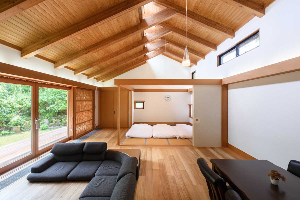 ー箱根こもれび庵ー すすき草原まで徒歩6分。四季折々の自然を感じられる2LDKの一軒家です。最大5名様まで宿泊でき、ご家族やご友人との滞在にぴったりです。 室内は和とモダンが融合した落ち着いた雰囲気。和室に布団3組、洋室にシングルベッド2台をご用意しています。 リビングにはテレビがあり、滞在中のリラックスタイムに最適です。バスルームでは光明石温泉を楽しめ、旅の疲れを癒せます。 施設内は階段のないフラットな造りで、年齢を問わず快適にお過ごしいただけます。なお、玄関前には石段と少しの段差がございますので、お出入りの際はどうぞお気をつけください。 徒歩圏内にバス停やコンビニがあり、目の前はゴルフ場。周辺にも複数のゴルフ場があり、ゴルフ好きにも理想的な立地です。 敷地内には無料駐車場2台分と、電気自動車用の充電スタンドもございます。 キッチンには基本的な調理器具や食器類に加え、ネスプレッソのコーヒーメーカーも完備。お好きな時間に香り高いコーヒーを楽しめます。 お子さま連れのご家族や、ゆったり過ごしたい方にも最適な空間です。 非日常のひとときを、ぜひこの特別な場所でお過ごしください。