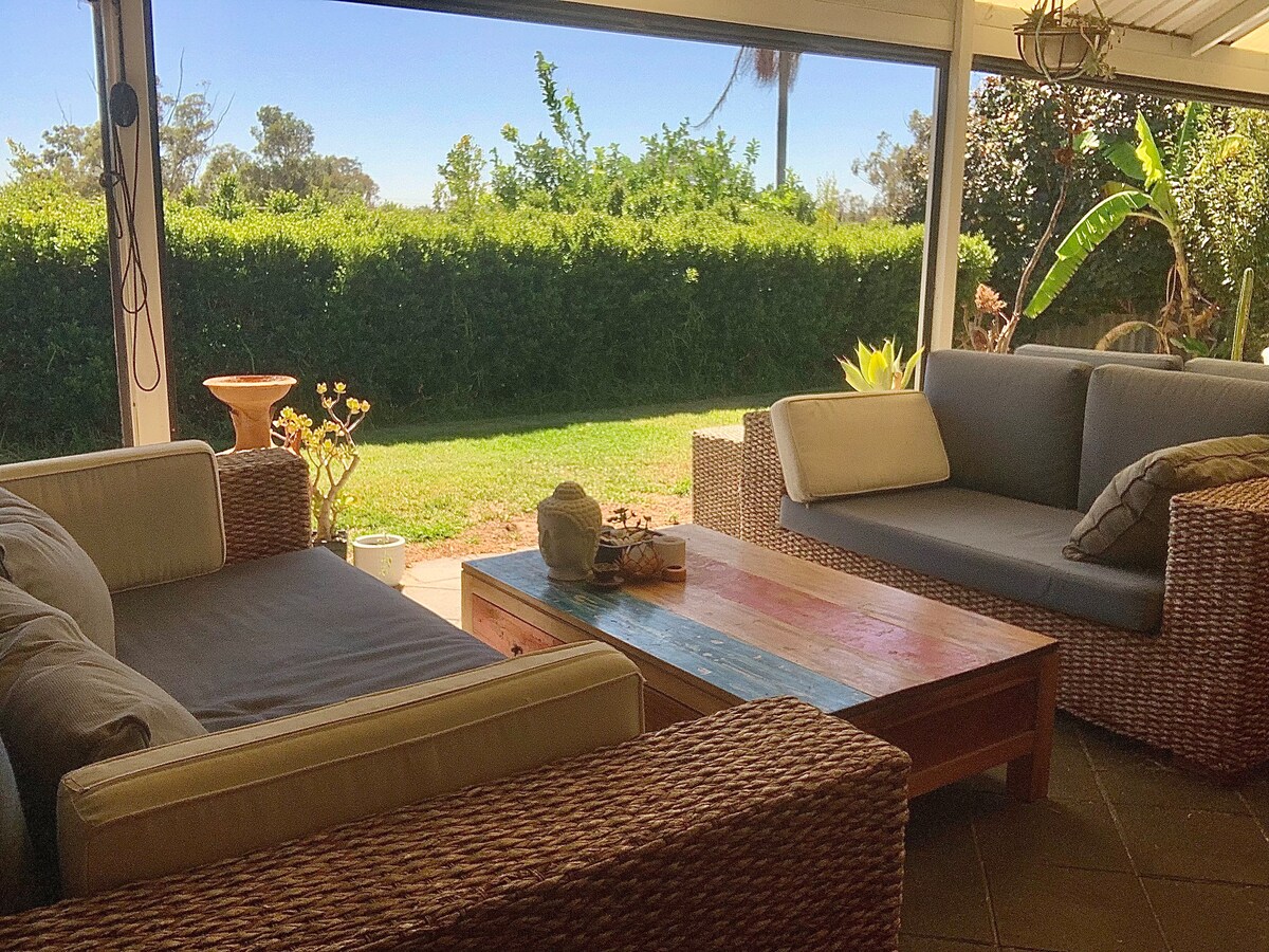 Silver Gypsy Flat adjoins our home. Key entry, secure steel window & door screens, a/c, table, chairs, pantry, induction cooktop, mini-oven, sandwich maker, frypan, kettle, toaster, pod coffee maker, juicer, glass oven, microwave, rice cooker, fridge/freezer, china, cutlery & glasses. Sofa bed for children, tv, lamps, queen bed, desk, chaise lounge, walk-in robe & ensuite, pillows, quilts & linen. Private garden, BBQ, patio table, chairs, brolly & free offroad parking. Late arrivals' Key Lock.