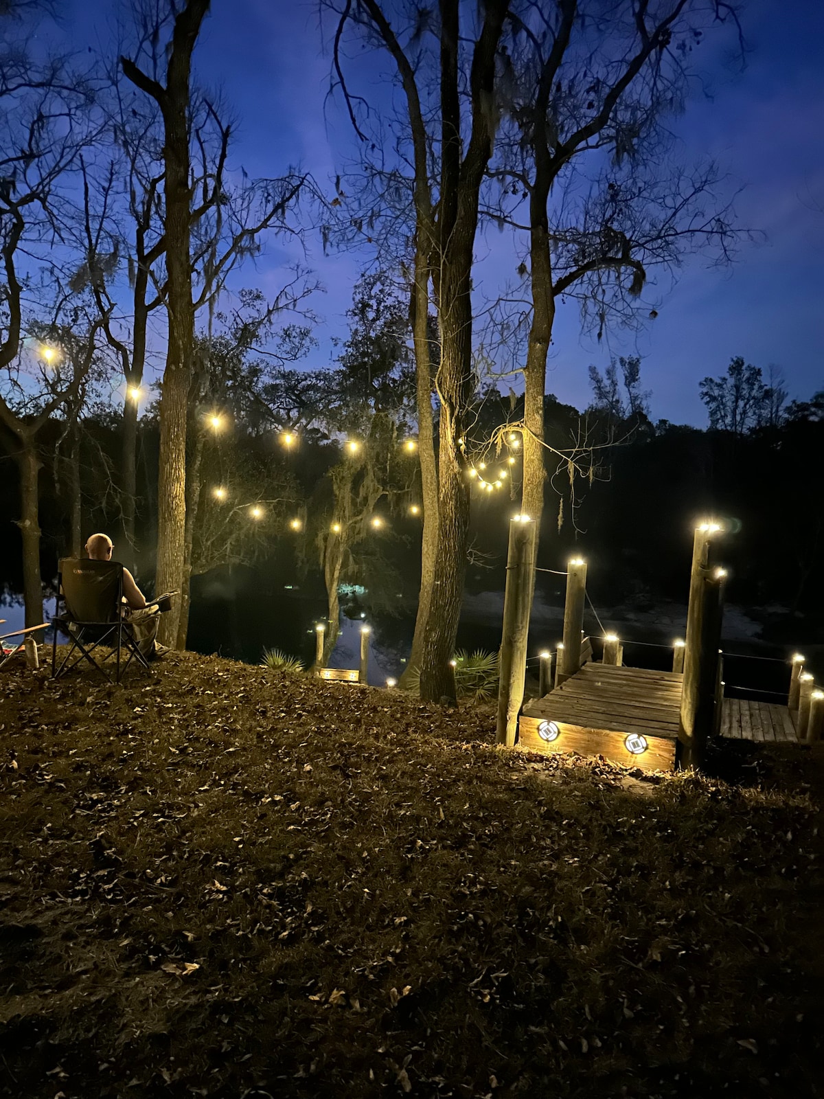Riverbend Retreat offers luxury and cozy comfort on the Suwannee River. Enjoy direct river access, a private dock for fishing and boating, and complimentary kayaks for exploring. The one-bedroom getaway features a fully equipped kitchen, plush furnishings, pullout sofa and a private deck overlooking the water. Relax by the fire pit under the stars. Pet-friendly and close to parks and towns, it’s the perfect spot to unwind and reconnect with nature.