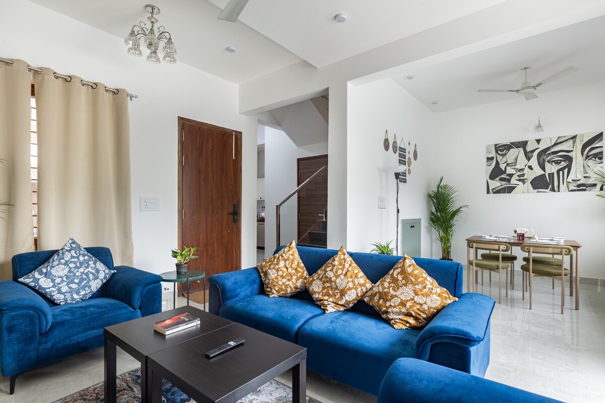 Experience serenity in this spacious 3BHK villa at Shubh Enclave, designed for families, founders, and creatives. Nestled beside lush greenery and a peaceful lake, ample sunlight and fresh air create a sanctuary for spaciousness, stillness and silence ✔ 3 king-size bedrooms w private attached washrooms ✔ Spacious living room with 55" Smart TV ✔ 2 airy balconies ✔ Fully equipped kitchen: microwave, stove, fridge, mixer utensils, Washing machine ✔ Daily cleaning available, cook on request
