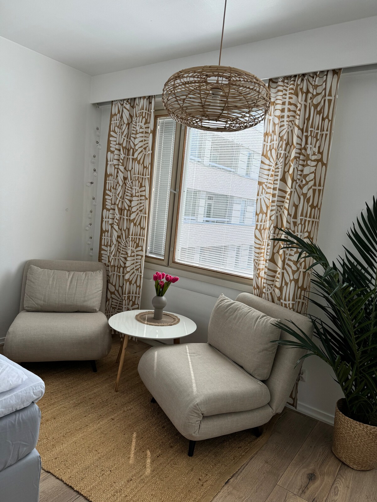 Valoisa ilmastoitu 35m2 yksiö, jossa erillinen makuutila, sauna sekä suuri lasitettu parveke jokinäkymällä. Rauhallinen sijainti lähellä keskustan ja Puuvillan palveluita, tapahtumia sekä Kirjurinluodon luontoa. Asunto on ihanteellinen 1-2 hengelle, mutta tilaa on jopa neljälle levitettävän vuodesohvan ansiosta. Lapsiystävällinen, sisäpihalla leikkikenttä. Vauvan matkasänky saatavilla pyynnöstä. Täysin varusteltu keittiö, parisänky, 140cm vuodesohva, 55" Led-smartTV, wifi