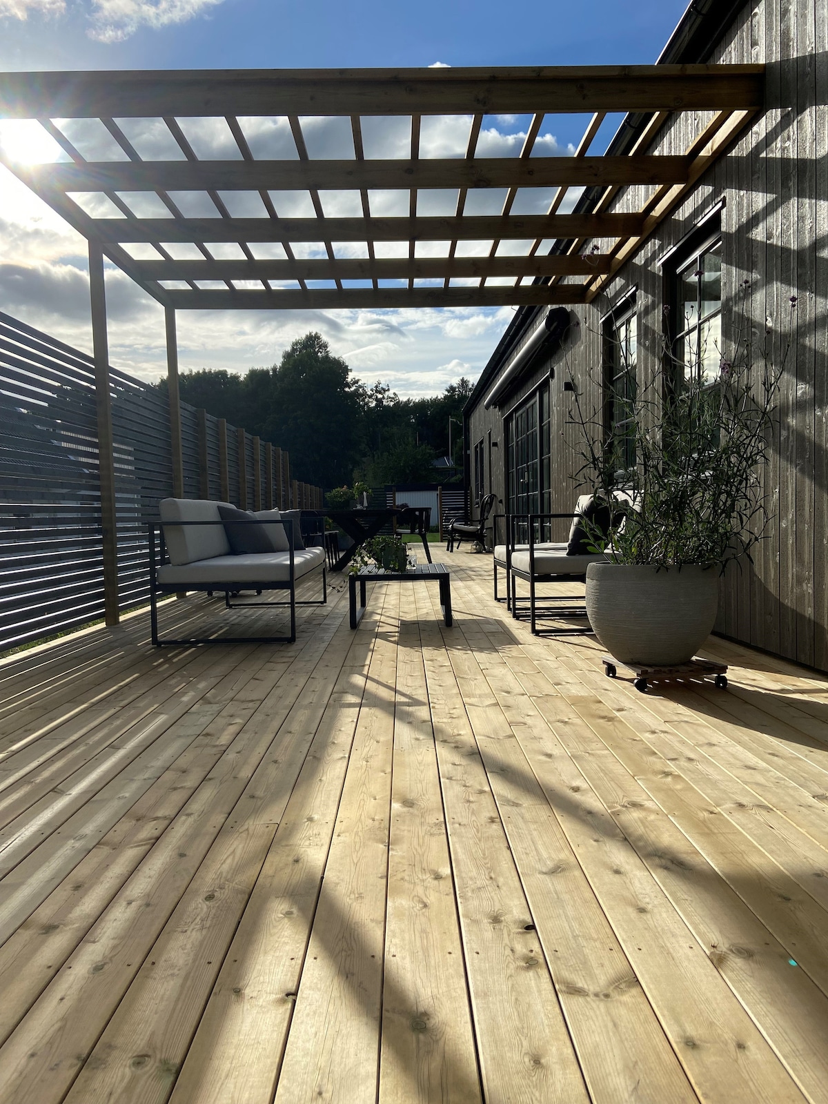 自然豊かなオイエルショにある190平方メートルの豪華な2階建てヴィラへようこそ。 自然や湖の近くにあり、ゴteborgの中心部(Liseberg停留所)までバスで15分です。 2023年に建てられたこの家には、オープンフロア、リビングルーム2部屋、シャワー付きのバスルーム2部屋、寝室4部屋、バーベキューナイトや日光浴を楽しめる素敵なパティオなど、多くの設備が備わっています。 オイエルショには、徒歩、自転車、または車で短時間でアクセスできる3つの湖があります。このエリアは家族に優しく、静かです。