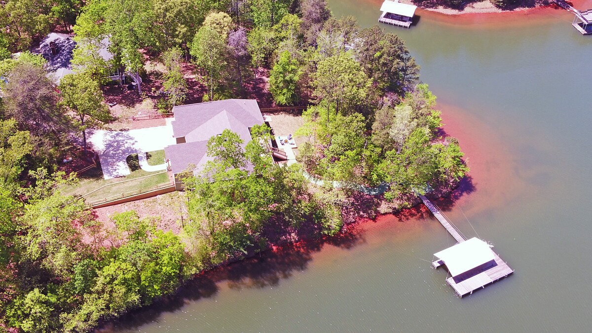 クレムソン近くのハートウェル湖の深い水辺にあるログハウス