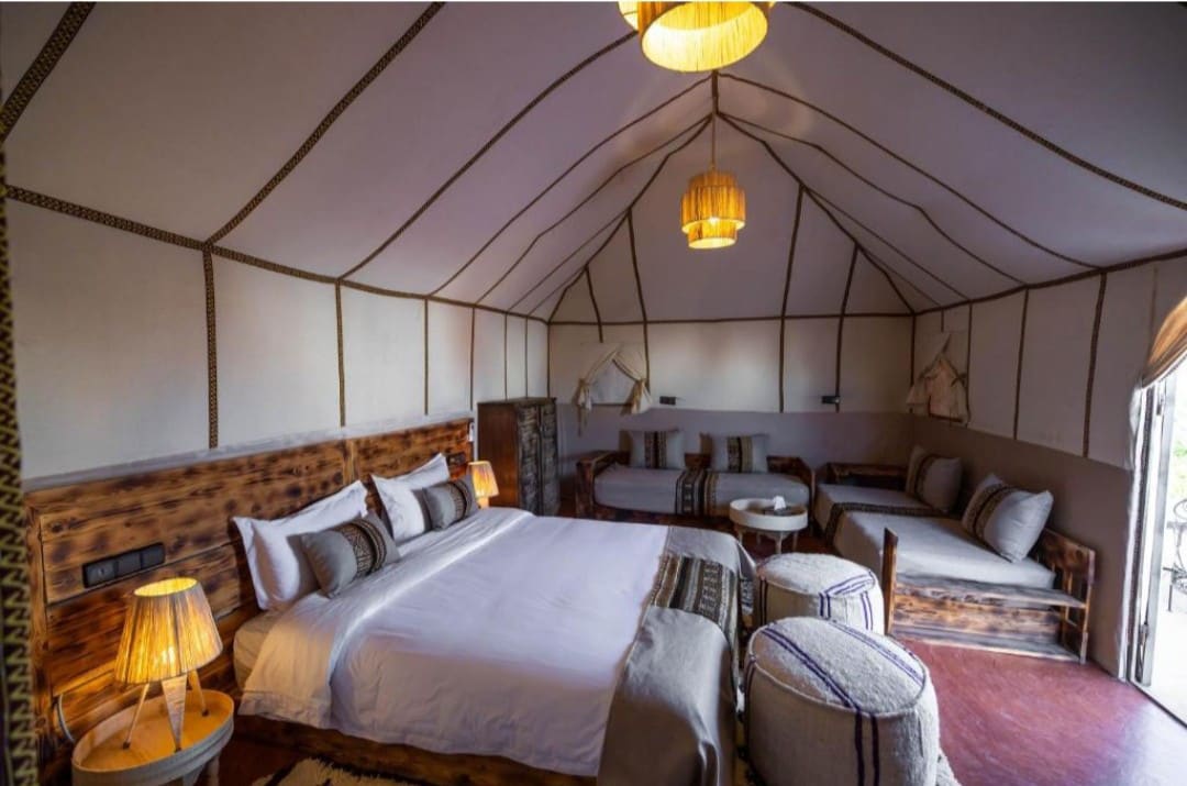 こちらの豪華なキャンプでは、砂丘でのラクダ乗り体験やエルグ・シェビ砂丘の夕日を眺めながら、砂漠の美しさを満喫することができます。各テントには快適なベッド、専用バスルーム、シャワーが備わっています。キャンプで美味しいディナーを堪能した後は、星空の下でリラックスし、キャンプファイヤーの周りでベルベル音楽を楽しむことができます。キャンプで素晴らしい日の出を見るチャンスもお見逃しなく。
