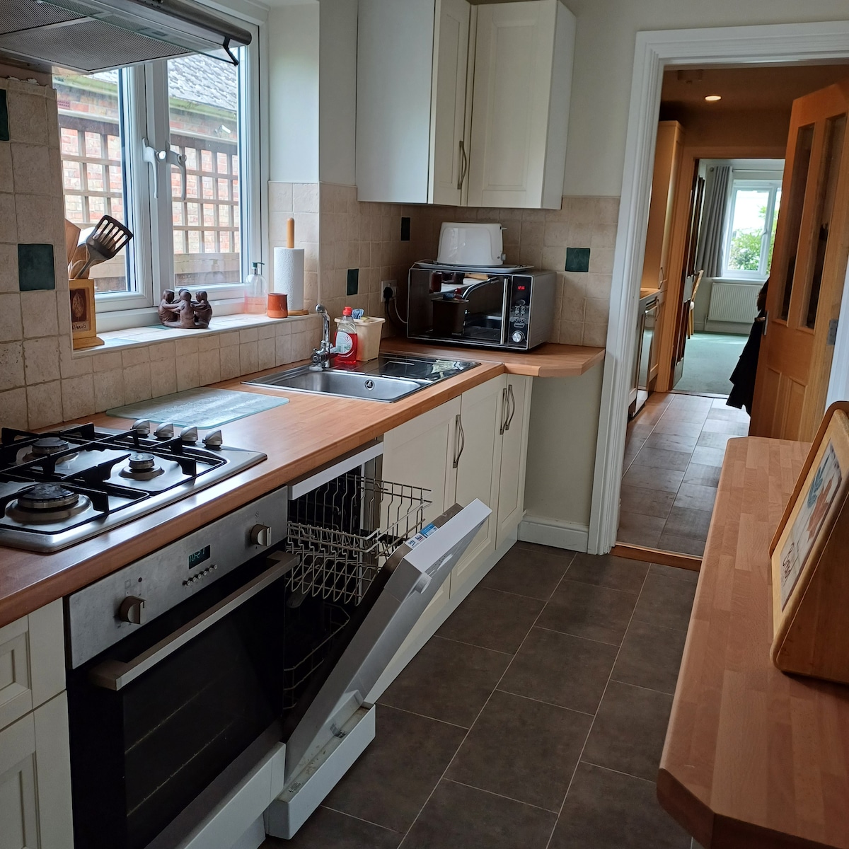 広々としたダブルベッドルーム(専用バスルーム付き)を備えたモダンな宿泊施設。ウォークインシャワー。 共用のユーティリティルーム。ご要望に応じて、洗濯機と乾燥機をご利用いただけます。 玄関脇に駐車スペースがあります。 狭長のキッチンと、朝食用の食材が入った冷蔵庫。 ダブルサイズの引き出し式ソファベッドを備えた広々としたラウンジ/ダイニングルーム。 Sky TVとインターネット(Sky Superfast)。 共有の大きなパティオと、テーブルと椅子が備わった専用の小さなパティオ。 幼児や小さなお子様向けのブランコがある広い庭。サッカーボールなどもご用意しています。 美しい散策道がある運河へと通じる門。