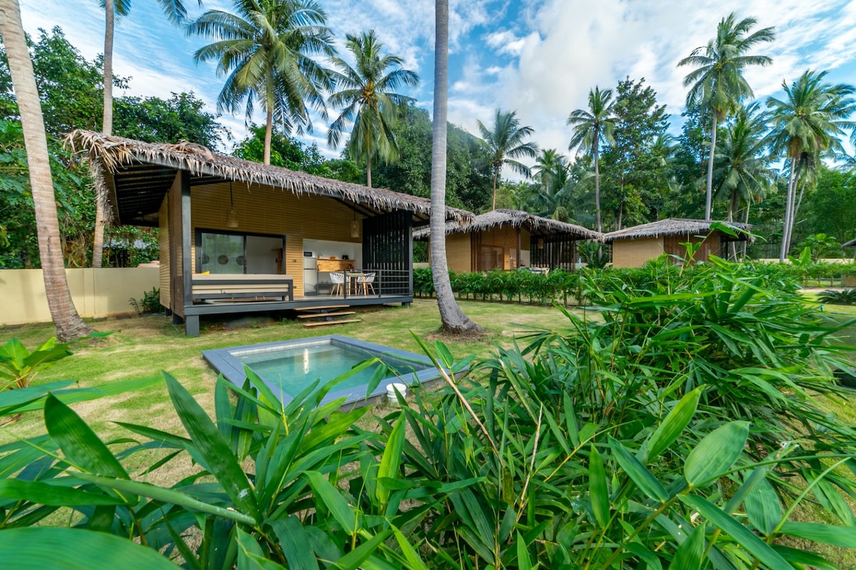 Suan Residence is the right place for nature-loving people who want to relax. The beach & city center are at waling distance (~7 minutes). Each bungalow is private so you can get quality time with the one you love. You will wake up with the birds singing and take your morning coffee surrounded by mountains and coconut trees. During the evening, you can watch stunning sunsets from your swimming pool. It is an eco-friendly project. We decided no to put AC but insulation instead to reduce the heat.