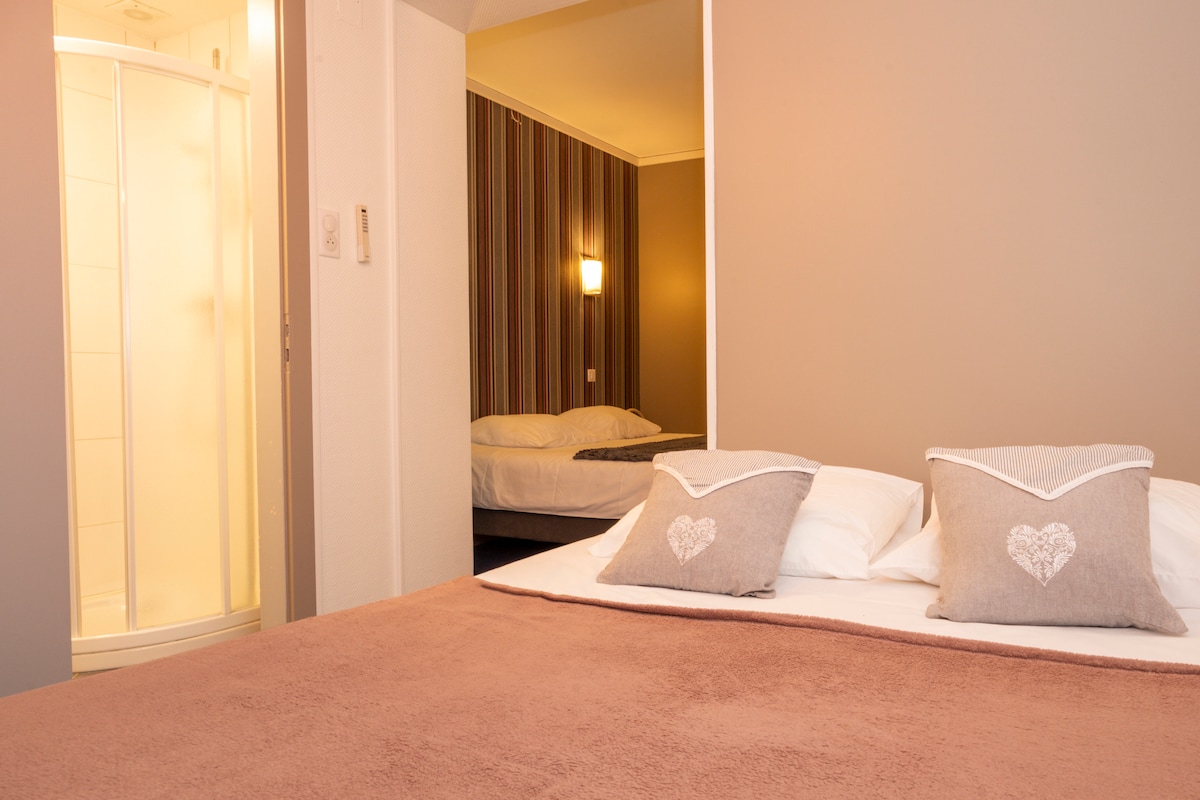 Vous ne voudrez plus quitter ce logement charmant et unique. Notre deuxième chambre de l'établissement se situe au dessus de notre restaurant. Arrivée autonome. Decor moderne. Idéal pour les familles. La suite familiale se compose de 2 chambres communiqante.
