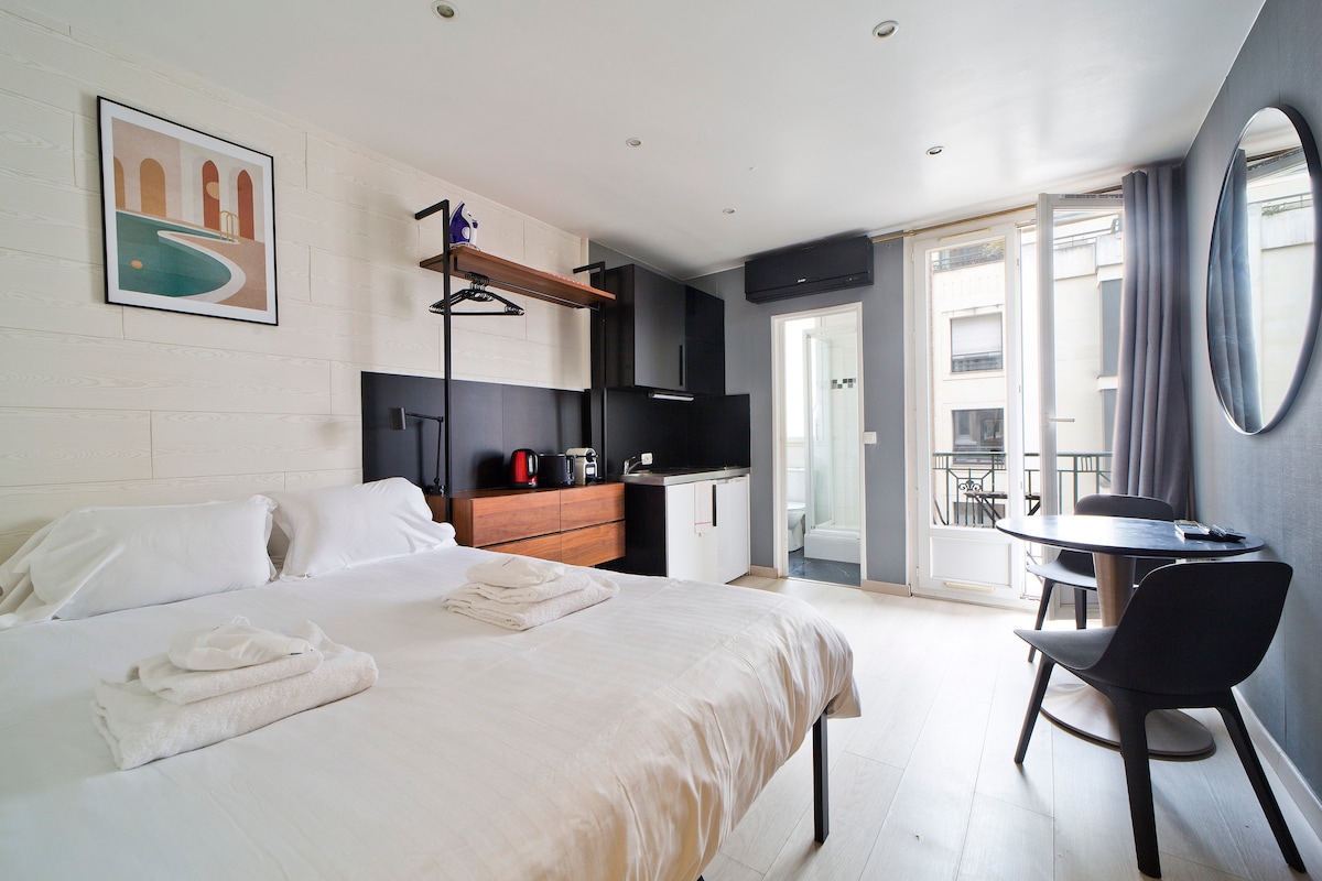 Very big and prestigious 55m2 studio who offer a stunning view with a huge bathtub JACUZZI, a very big bed as well as a Italian shower. Located in a quiet and safe area 10min from the famous Avenue des Champs Elysées (center of Paris). I offer for 95€ an optional “ROMANCE PACKAGE” to SURPRISE your love one. It comes with petals of roses, candles placed on a heart shape on the bed (a Happy Birthday sign can be added) and for 175€ it comes with a good bottle of champagne and strawberries! 🌹🥂🍓