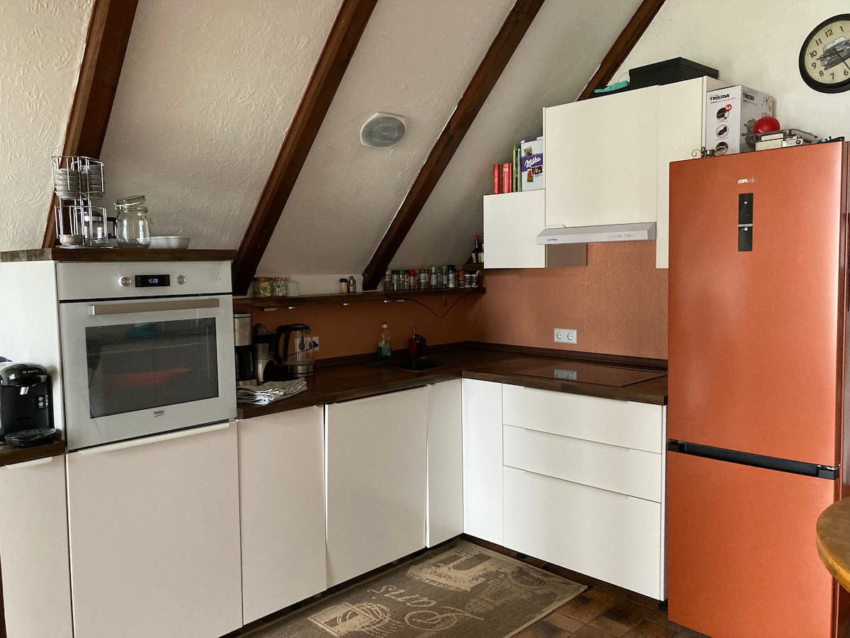当社の最初のアパートメントは、かつての牛小屋の前半分にあります。1階には魅力的なキッチンアイランド、ダイニング&リビングエリア、バスルームがあります。上階の寝室にはダブルベッド1台とシングルベッド1台があり、さらに2名様用の快適なソファベッド1台もあります(合計5名様までご宿泊いただけます)。 2つ目の宿泊施設「Eulennest」はすぐ隣にあり、一緒に予約できます。そうすれば、最大8名様まで宿泊可能です。