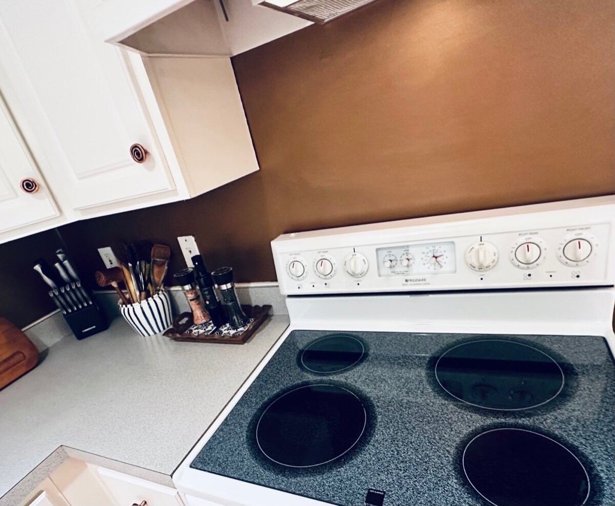 この快適な1ベッド/1バスルームの1階ユニットでスタイリッシュにお過ごしください。車道2台分。 キーパッドで入るリビングには、ソファベッド、ワークデスク、椅子、50インチのサムスンスマートテレビが備わっています。 花崗岩のカウンターを備えたキッチンには、必要なものがすべて揃っており、座って食事をするための朝食バーもあります。 花崗岩はバスルームの洗面台にも使われており、アメニティが揃った広いカウンターと引き出しスペースが備わっています。 寝室には、クイーンベッド、ドレッサー、ウォークインクローゼット、スマートテレビ、電気暖炉が備わっています。 引き戸を通ると、グリルとビストロセットが備わった庭につながります