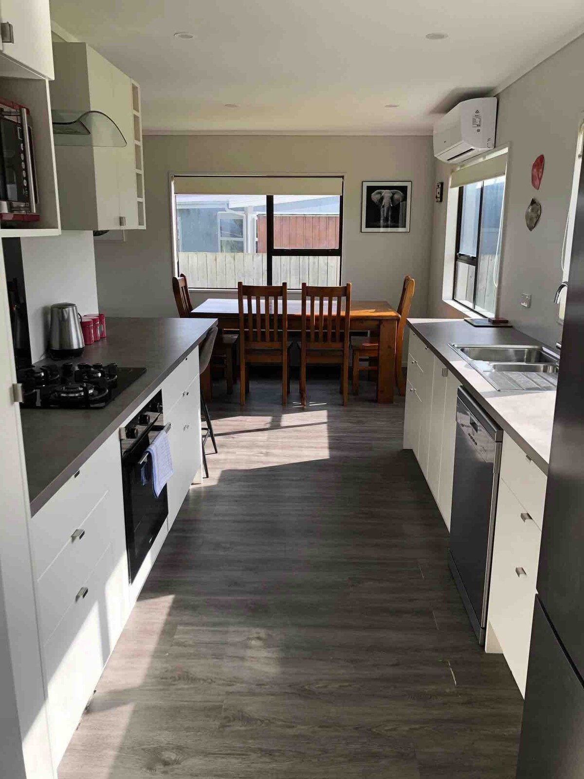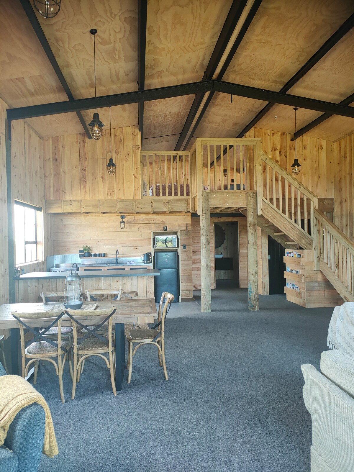 With wooden interior and carpeted floors with free standing fireplace, our accomodation is both spacious yet cosy. The master bedroom has a cabin feel to it with a comfy bed and views out onto farmland. The Loft is a spacious cosy area with low ceilings which the teenagers will love but tall people may not enjoy it as it's only about 1.75 cm at the highest point . large couches for watching netflix or relaxing on the deck. we are not set up for young children and think it's best suited to 8+ age