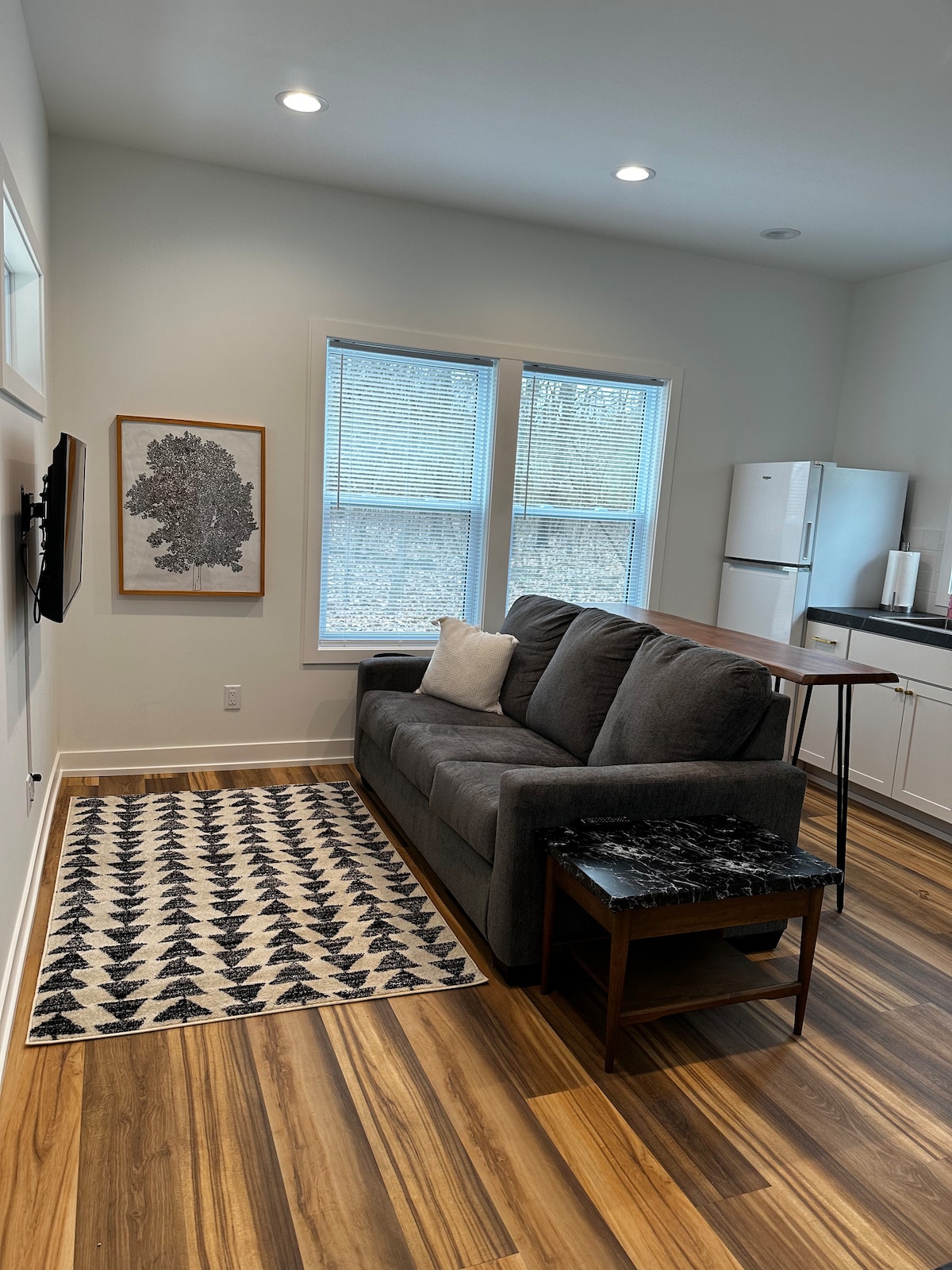 オセゴのダウンタウンにあるとてもユニークなアパートで、ショップ、レストラン、バーまで徒歩で行けます。 最近改装されたこの空間は、1920年代の銀行の金庫室の上にあり、素朴で工業的な雰囲気があります。 キッチン、バスルーム、ワークエリアに素朴なセラミックタイル、リビング/ベッドルームに竹の床、花崗岩カウンター、タイルのバックスプラッシュ、銅製シンク、ガラスドア付きタイルシャワーを備えています。65インチのスマート薄型テレビ、電気暖炉、Wi-Fi、セントラルエア/ヒート、ビューターブロックデスクが組み込まれています。