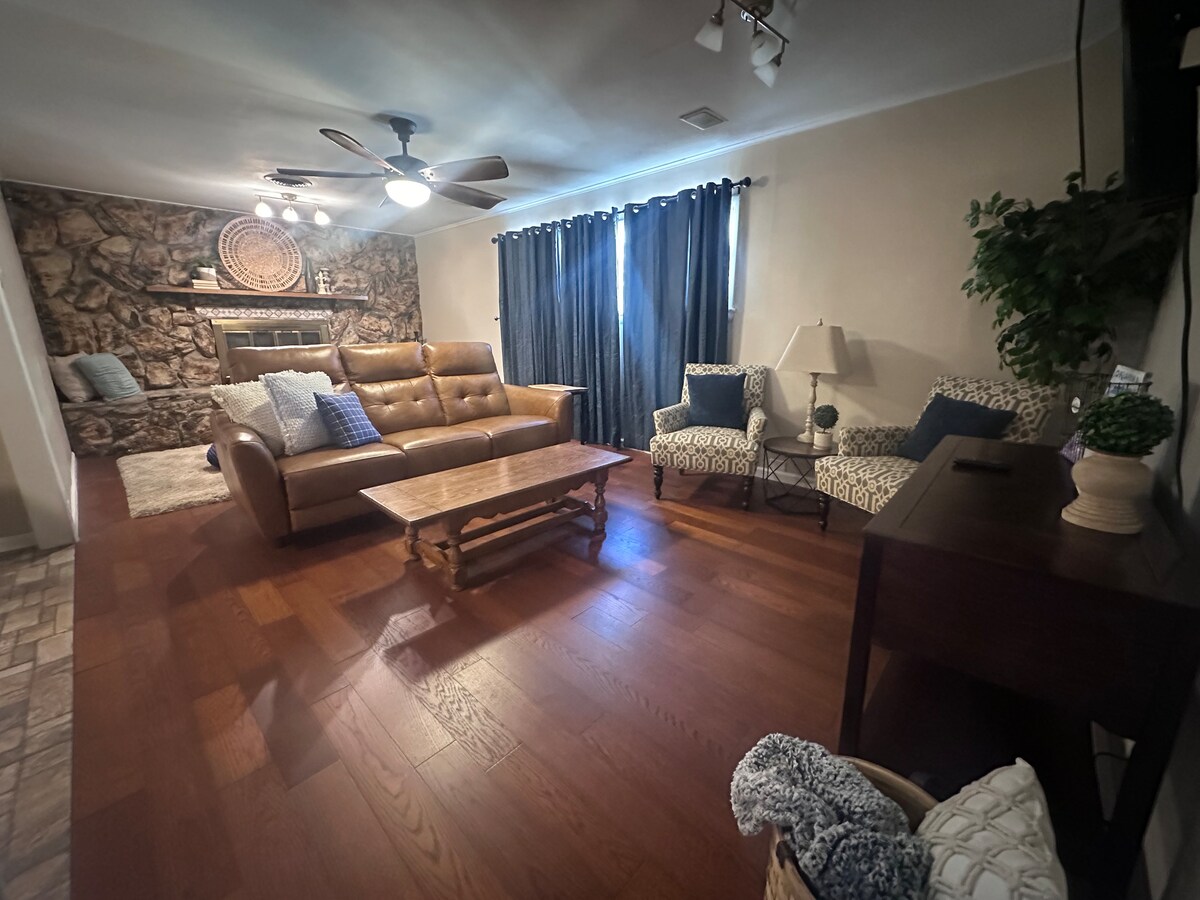 Beautifully renovated turnkey home perfect for families! This charming residence comfortably sleeps 7 and offers complimentary Wi-Fi. Nestled on a corner lot surrounded by mature trees, the home features a fresh, airy exterior with new paint, a welcoming front porch, and a side porch for relaxing. Original refinished pine floors and classic molding that capture the home's historic charm.