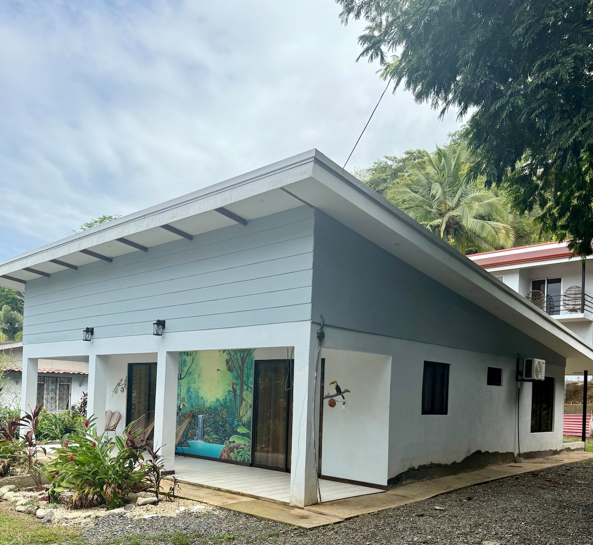 自然に囲まれたモダンなスイートで、有名なサーフビーチのプラヤエルモサ(ハコの近く)からわずか2分です。 寝室2部屋(エアコン付き)、バスルーム1部屋、屋外の屋根付きキッチン/ダイニングエリアを備えた快適な空間です。庭園の景色を眺めながらテラスでリラックスし、毎日訪れる白いサル、オウム、オオハシを見つけましょう。 ゲストスイートは1階にあり、専用の入り口がありますが、ホストファミリーが住んでいる私たちの家の一部です。フェンス付きの庭と駐車場は私たちと共用です。