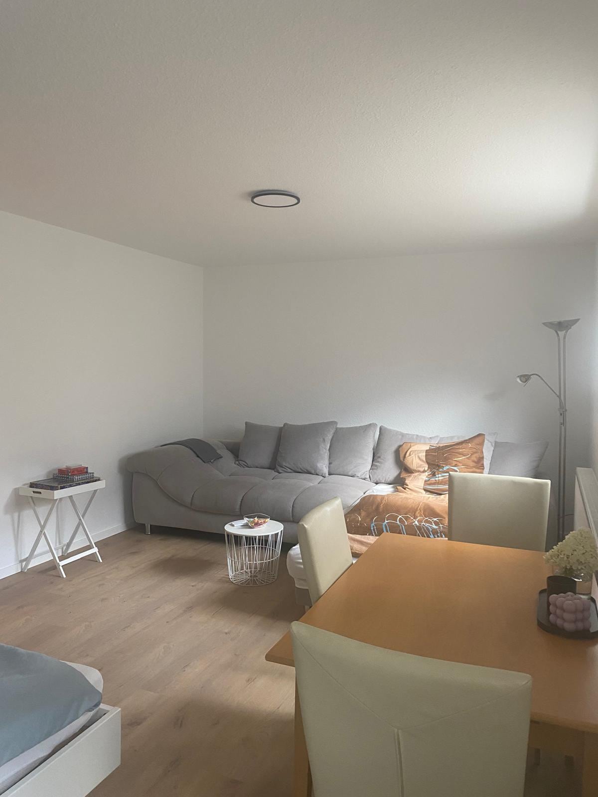 Modern 30 m² basement apartment in Hagenbüchach with bedroom/office and living/dining area incl. kitchenette, private bathroom, and sleeping space for up to 4 guests. Features include a pull-out bed, sofa bed, foldable table and desk, USB outlets, and climate comfort via floor heating/cooling. Ideal for singles, couples, or small families. Cat-friendly pets are welcome.