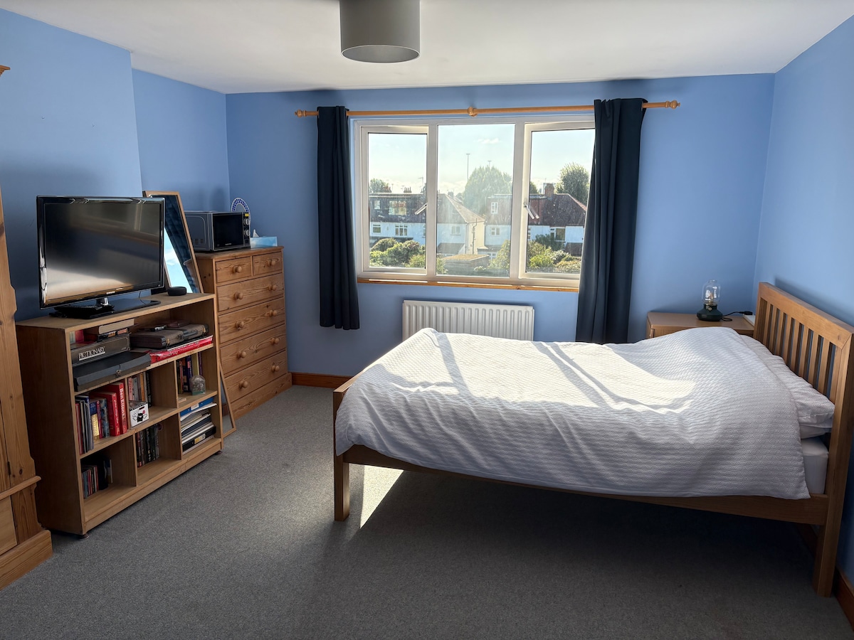 広々としたダブルルームは、2ベッドルームの家の中にあり、ロンドン・ヒースロー空港からわずか3マイル、フェルサム駅からわずか1マイルのところにある静かな袋小路の角にあります。フェルサム駅からはロンドンへ直通電車に乗ることができます。 家のすぐ外に無料駐車場があります。 お部屋は清潔で収納スペースがたくさんあり、テレビとWi-Fiがあります。 ノートパソコンの使用に最適な折りたたみ式ワークステーション。 ご要望に応じて、タオルを5ポンドでご提供します。 キッチン、2階のバスルーム、1階の別のトイレをご利用いただけます。