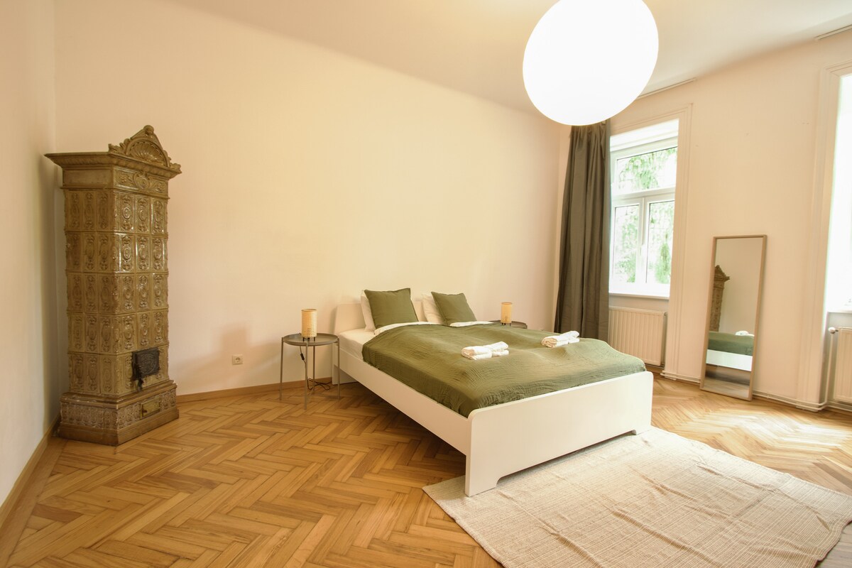 広々としたスペース/キッチン、ダイニング、リビングを1つに。 新しい木製の寄木細工の床。 快適で居心地の良いダブルベッドを備えた2つの独立した寝室は、つながりのある人のために最初の寝室を通す必要があります。 洗濯機と食器洗い機-すべてのキッチン用品、ネスプレッソマシン、フレンチプレス。 内外は落ち着いています。 一歩で庭にいて、素敵なアンサンブルに座ることができます。 路面電車・バス、ショップ、公園、プールまで徒歩圏内。市内まで15分。 猫はご遠慮ください。