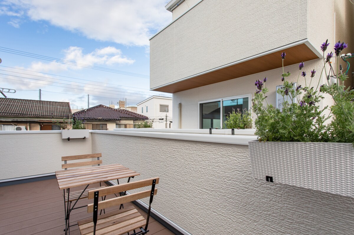 屋外バスタブと庭付きの2階建て別荘、3ベッドルーム2バスルーム、無料駐車場、4本の電車路線、徒歩で京瓷巨卵、アメリカ村、心斎橋