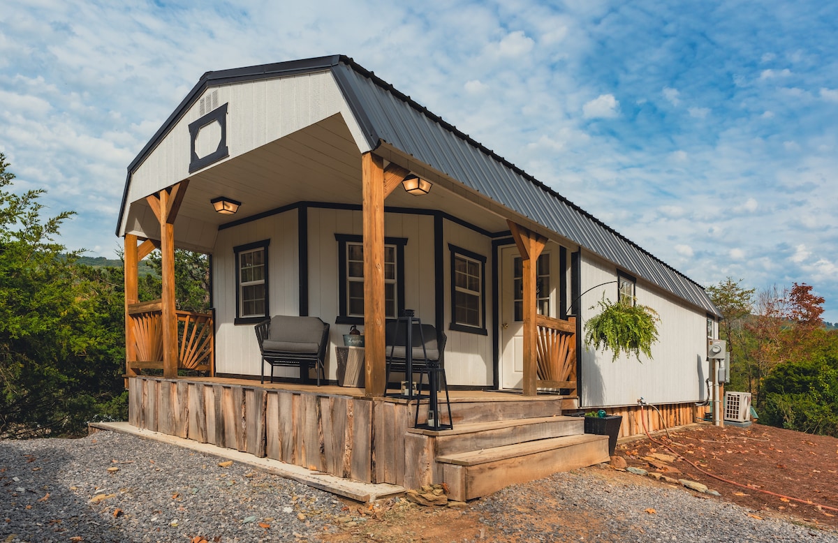 Beautiful, charming tiny cabin with a spacious feel. Queen size bedroom. Loft over kitchen with mattress on floor to not accessible by wooden ladder. Pull out/lay down couch in living room. Enjoy sitting/dining outside overlooking the lake after grilling on Blackstone at cabin or grilling/making homemade pizzas in the outdoor pizza oven in the common patio area close by. Fish in the stocked lake, kayak, swim, or just relax sitting on the docks and enjoy nature. No pets, no smoking inside