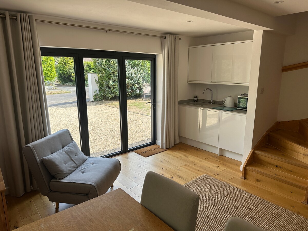 広々とした独立したお部屋で、専用玄関をご利用いただけるため、ご自由に出入りしていただけます。キングサイズベッド。専用シャワールームには、男性用と女性用の洗面台がそれぞれ用意されています。ダイニングテーブルと椅子2脚、冷蔵庫、やかん、トースター、電子レンジを用意しています。 日当たりのよいパティオと庭に直接アクセスできます。 朝食用のお菓子をご用意しています! スティーマー・ポイントビーチとフライアーズ・クリフビーチまで徒歩8分。 ビーチハット・カフェまで徒歩10分。 新設のパデル&ピックルボールセンター「Advantage Padel」まで徒歩15分 ハイクリフ城まで徒歩20分。 ムデフォード・キーまで徒歩30分。
