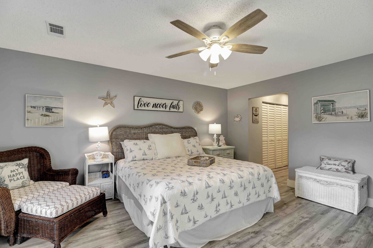 ビーチハウスへようこそ-家族で楽しめる宿泊先です!4ベッドルームのオアシスの雰囲気を満喫してください。プライバシーを高めるために、バンクハウスが別にあります。星空の下、焚き火と屋根付きグリルポールバーンを備えた広大な裏庭のジャグジーで贅沢におくつろぎください。友達や家族と卓球をしたり、暖炉とダイニングエリアのあるスクリーンポーチでくつろいだりしょう。ゴリラカートを自由に使えるので、ビーチ用品の運搬も簡単です。ビーチでの休暇で、無限の楽しみと思い出を作りましょう!