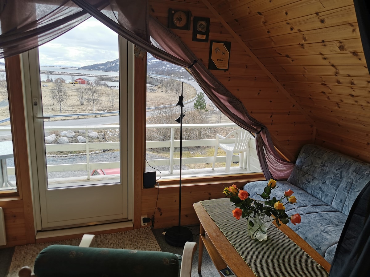 Welcome to our peaceful accommodation in the countryside with a balcony and beautiful views of the Lofoten mountains, the sea, the northern lights and the midnight sun. Own apartment on the 2nd floor in the garage with a balcony, bathroom, combined kitchen and living room with a double bed for two people, a sofa bed for two people and two extra guest beds. There is also a home cinema system. Short drive to Lofoten, moose safari, reindeer farm, whale watching and other nature experiences.