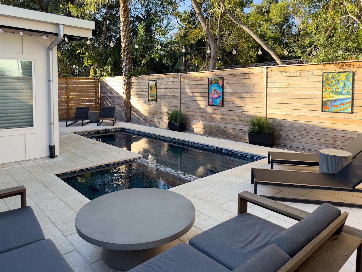 🏝️ Luxurious Private Heated Pool Home In Historic Downtown and Family Friendly! - Private Heated Pool & large backyard with tons of gorgeous palms - Outdoor cabana with grill, fans, pool table, kid toys, bocce, corn hole, recessed lights and seating - Walking distance to the Castillo de San Marcos Fort, Fountain of Youth, Uptown shops, The Bayfront and St. George Street - Less than 10 mins to Vilano Beach 🌊 - Sleeps 6/ 2 King beds, 2 XL twin beds (daybed trundle) - Pet Friendly - Event Venue