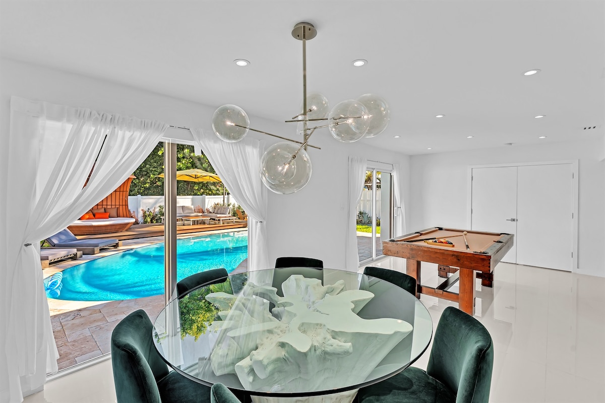 イントラコースタルから徒歩圏内、ビーチまで数分の場所にある、ゲート付きの高級コミュニティにあるこの豪華な海辺の隠れ家に逃避行しましょう。アーチ型の天井、自然光、居心地の良い暖炉がリラックスした雰囲気を演出します。ビリヤード台、ストリーミング対応のスマートテレビ6台、高速Wi-Fi、5台以上の駐車スペースをご利用いただけます。ガレリアモール、人気レストラン、カフェまで徒歩で行けます。フォートローダーデールでの滞在に最適な快適さ、スタイル、ロケーションの完璧な融合です。