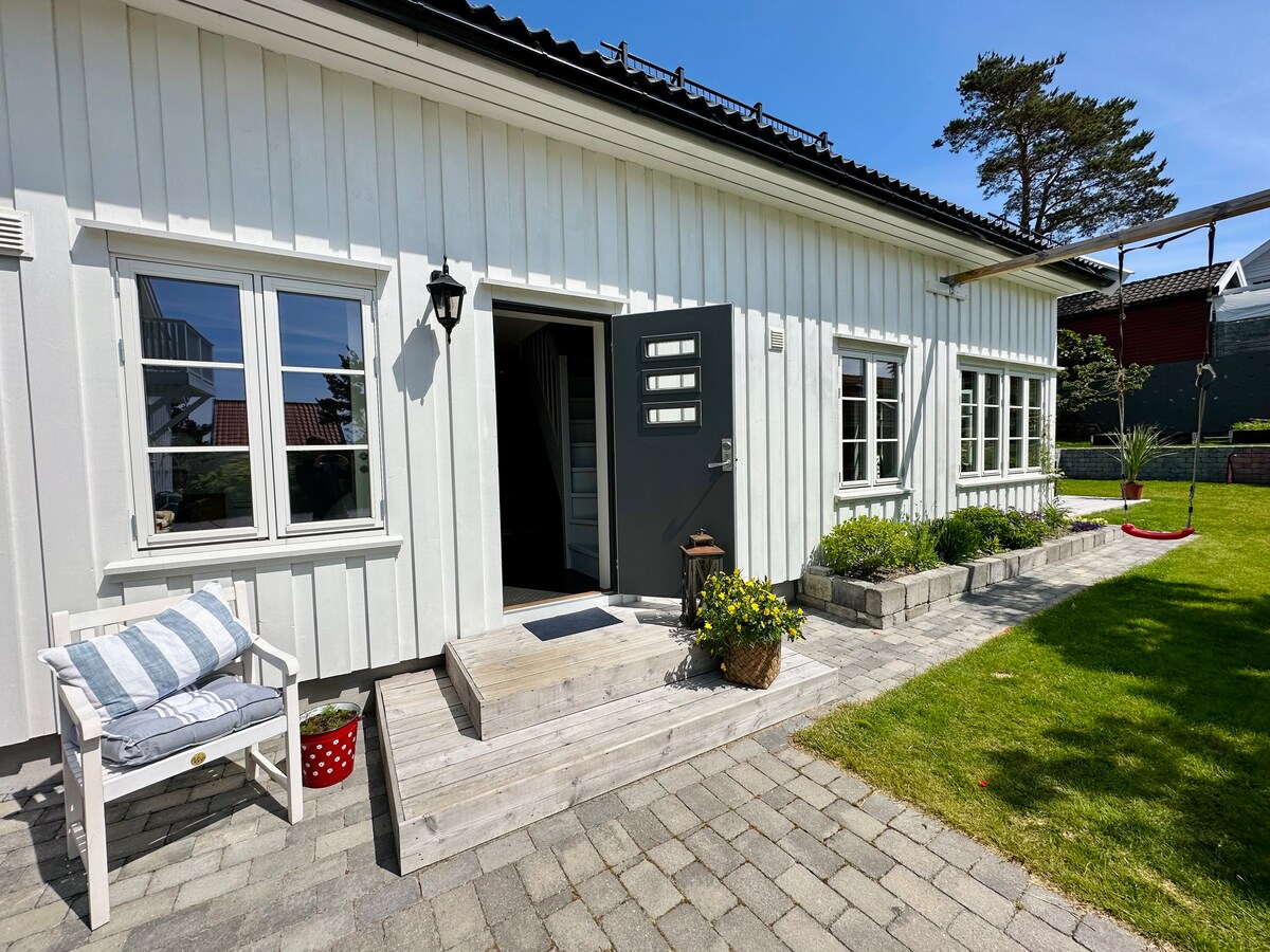 Kosel og landlig ferieleilighet over 2 etasjer.Barnegrind på terasse og inne ved trapp 2 soverom med dobbeltsenger, 2 gjestesenger 90 cm ,da den øverste madrassen er behagelig tempur madrass. 1 bad med vaskemaskin og dusjkabinett .Stor terasse.Gassgrill og utemøbler.Stor plen. Kort avstand til sjøen og Dyreparken ca 7 km.15 min gange til fiske og badeplass ved sjø.Sørlandsenteret ligger rett ved Dyreparken.10 km til Sommerbyen Lillesand og 20 km til Kristiansand