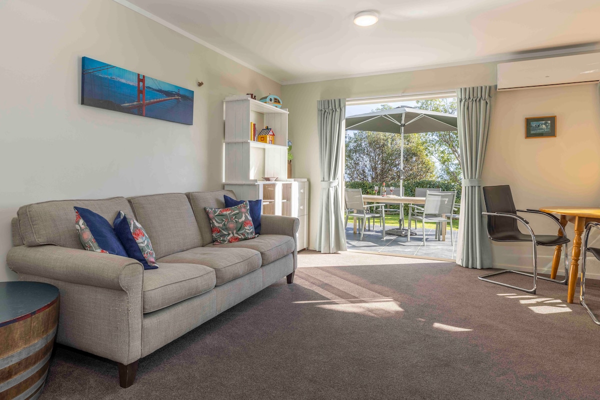Escape the hustle and bustle and unwind in our peaceful, sparkling oasis. Park at the door of this quiet stylish, spacious hillside apartment with french doors onto a sunny patio and lawn with BBQ/outdoor furniture. Wake to native bird melodies, sea views, amazing sunsets and plenty of space. Full kitchen, own laundry, one bathroom with bath and shower and a separate wc. Two bedrooms with queen beds and electric blankets (April-Nov). Air conditioning and heating for year-round comfort