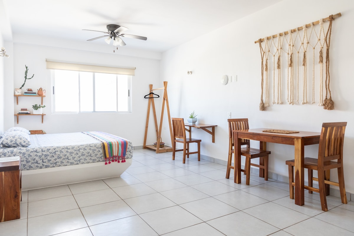 カンクンのダウンタウン中心部に位置する快適なワンルームアパートをお楽しみください。多くの地元レストランに近く、ホテルゾーンへ向かうバス停から徒歩10分です。 宿泊施設の規則をよくお読みになり、チェックイン時間は午後3時から8時までであることをご考慮ください。