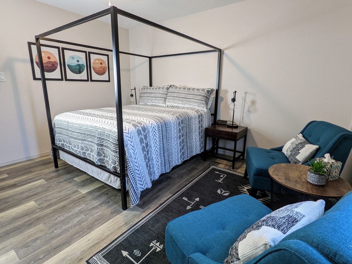 こちらのおしゃれな宿泊先は、団体の出張者やご家族やご友人にぴったりです。デザイナーによって装飾され、モダンな基準に完全に改装され、2階にあり、専用玄関があります。広々としたベッドルームには、ワークデスクとオフィスチェアが備わっています。キングベッドルームはスイートルームです。設備が整ったキッチンとダイニングエリアで、狭いホテルの部屋ではなく、我が家のような居心地を味わえます。駐車場は十分にあります。グレッグストリートから1ブロックのところに銀行、レストラン、コインランドリーがあります。