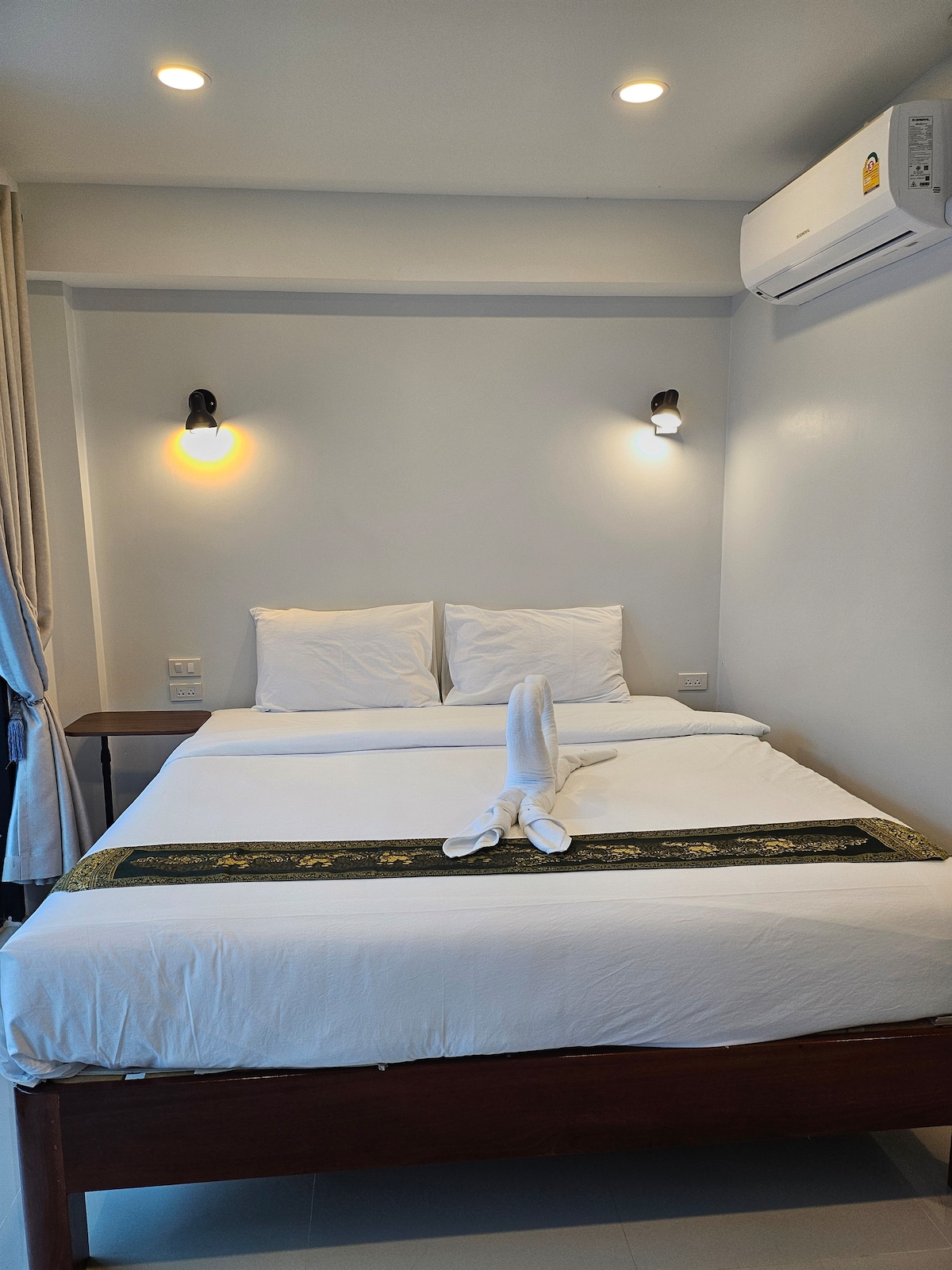 お部屋は7階にあり、建物の北側にあります。 正面は海、背面は山です。 建物の下には、子ども向けのコーヒーショップやカフェがあります。 部屋の広さ:47.5㎡ ベッドサイズ:キングサイズ(2名様用) 料金: 平日1泊2500バーツ 週末は1泊3000バーツ 長期滞在の料金 14000バーツ/月 (朝食サービスはございません) 景色を楽しむためのバルコニーテーブルがあります