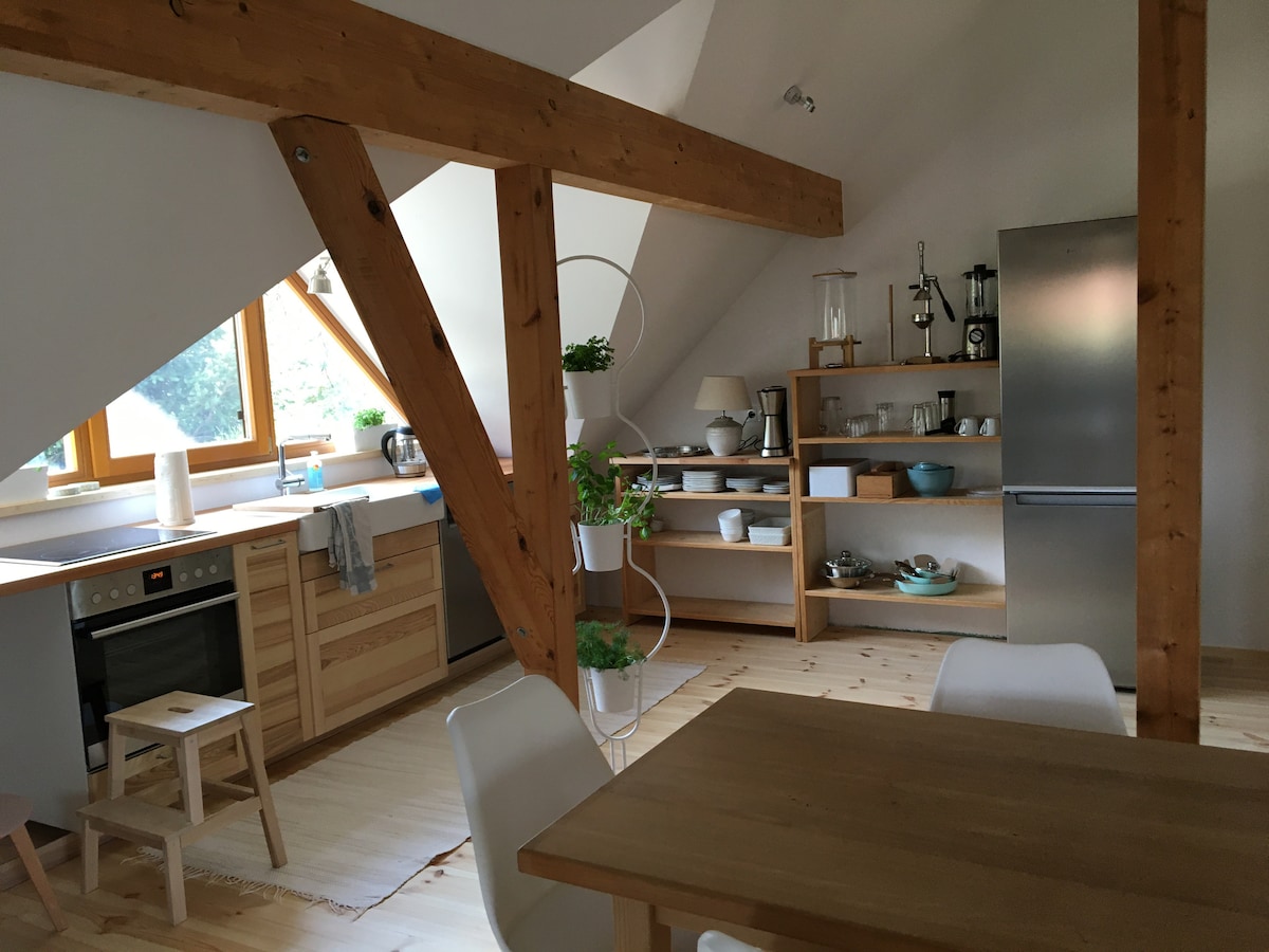 部分的にアンティーク、部分的にモダンな屋根裏ワンルーム( 28平方メートル)、モダンなキッチン、2階、 静かで日当たりが良く、快適です。 バラ園のあるガーデン小屋があるテラスが使えます。 バス305 (ダウンタウン、中央駅、フェスティバルホール) 50メートル、ミステルバッハエンラン、スーパーマーケット、銀行、レストラン、地下300メートルの距離にあるガソリンスタンドからダウンタウン(ロートメインセンター、映画館、歩行者ゾーン)までロマンチックに歩いて15 ~ 20分