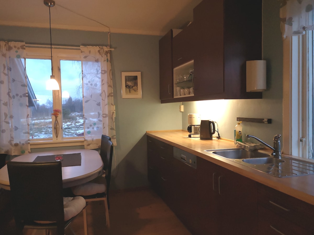 スタジオアパートメントの独立した入り口。 窓は庭と真夜中の太陽/海/オーロラに面しています。 ガーデンテーブル、ガーデンチェア。 ダブルベッド150 cm 高速Wi-Fi、ケーブルテレビ。 簡易キッチン、2皿コンロ。お茶、コーヒー、朝食が含まれています。 電子レンジ、冷蔵庫/冷凍庫、必要な設備。 2人用のディナーテーブル。 窓付きのバスルーム。 洗濯機+乾燥機。 ナルヴィクの中心部の閑静なエリアにあります。 市内中心部まで徒歩9分、 鉄道駅とフライトバス。 小さなビーチまで徒歩3分。